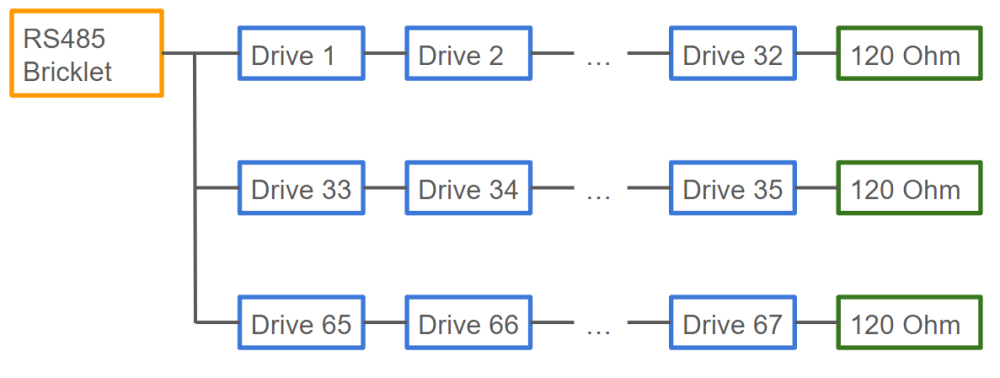 Vielen Dank für deine ausführliche Antwort! Deine Antworten und Tipps haben mir beim Troubleshooting sehr gut geholfen und mittlerweile steht die Kommunikation zwischen Bricklet und Servodrive. Wie du vermutet hast handelt es sich um holding register und nicht input register. Ein weiterer Fehler meinerseits waren die Angaben zu Baudrate, Parity und Stop Bits. Da hatte das Servo Drive leider komplett andere Werkeinstellungen als im Datenblatt angegeben waren. Ich hoffe nun, dass wenigstens alle Servo Drives die gleichen Einstellungen haben. Folgende weitere Frage ist noch aufgekommen: Wie viele Slaves kann ich in meinem Modbus haben? Theoretisch sind ja 247 verschiedene Adressen möglich, allerdings habe ich bei einem sehr ähnlichen Servo Drive wie jenem den ich jetzt verwende gelesen, dass maximal 32 Slaves möglich sind: In einem Modbus Grundlagen Datenblatt habe ich ebenfalls von diesen maximalen 32 Slaves gelesen. Ist es lediglich möglich mehr als 32 Slaves zu haben wenn man einem repeater verwendet? Oder kann man den Modbus sternenförmig anordnen wie im Bild unten um mehr als 32 Slaves anzusteuern ohne repeater? Ist die maximale Anzahl Slaves abhängig von der Kabellänge oder Kabelqualität? Für meine Anwendung habe ich folgende Kabel ausgesucht: CAT6 S/FTP, die sind so wie ich verstanden habe ungefähr im Mittelfeld was Qualität und Abschirmung angeht. Passen die, oder sind die Overkill? Die Frage kommt evt. stark auf meine Anwendung und das Umfeld an ;) Freundliche Grüsse Fridolin -