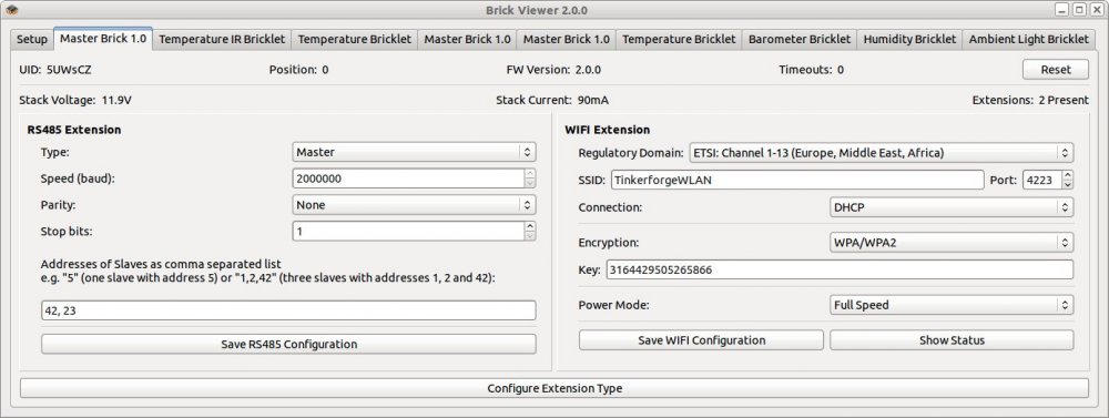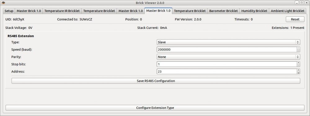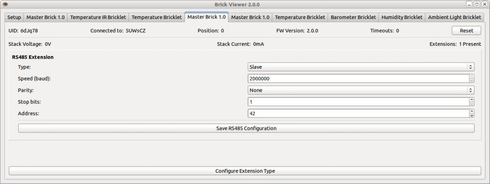 Echt komisch. Du hast aber bei beiden RS485 Extensions auch die gleichen Einstellungen, ja? Ich hatte schonmal ausversehen in einem Netzwerk eine RS485 Extension mit 1 Stopbit und eine mit 2 Stopbits. Das funktioniert dann auch nur sehr sporadisch. Wenn es einwandfrei funktioniert sobald du nur einen RS485 Slave hast, kann es ja nicht am AP liegen, denke ich. Du könntest auch noch einmal Probieren das EEPROM auf allen RS485 Extensions einmal auf Auslieferungszustand zurück zu setzen (im Brick Viewer unten bei "Configure Extension Type" nochmal RS485 auswählen).