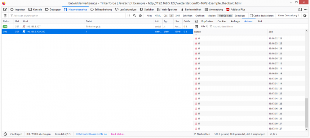 Ja! Danke für die Antwort. Hier kommt mein Code... <!DOCTYPE html> <html> <meta http-equiv="Content-Type" content="text/html; charset=utf-8" /> <head> <title>Tinkerforge | JavaScript Example</title> </head> <body> <div style="text-align:center;"> <h1>IO-16 Bricklet 2.0 Interrupt Example</h1> <p> <input value="192.168.5.42" id="host" type="text" size="20">: <input value="4280" id="port" type="text" size="5">, <input value="2fYVua" id="uid" type="text" size="5"> <input value="Start Example" id="start" type="button" onclick="startExample();"> </p> <p> <textarea readonly id="text" cols="80" rows="24" style="resize:none;" >Press "Start Example" to begin ...</textarea> </p> </div> <script src="./js/tinkerforge/Tinkerforge.js" type='text/javascript'></script> <script type='text/javascript'> var ipcon; var textArea = document.getElementById("text"); function startExample() { textArea.value = ""; var HOST = document.getElementById("host").value; var PORT = parseInt(document.getElementById("port").value); var UID = document.getElementById("uid").value; if(ipcon !== undefined) { ipcon.disconnect(); } ipcon = new Tinkerforge.IPConnection(); // Create IP connection var io = new Tinkerforge.BrickletIO16V2(UID, ipcon); // Create device object ipcon.connect(HOST, PORT, function(error) { textArea.value += 'Error: ' + error + '\n'; } ); // Connect to brickd // Don't use device before ipcon is connected // ipcon.on(Tinkerforge.IPConnection.CALLBACK_CONNECTED, function (connectReason) { // Set period for input value (channel 4) callback to 0.5s (500ms) // theobald ipcon.authenticate( "9Pttfnn9zh00i0uCQvNnnUedd", (ok) => { textArea.value += 'auth OK\n'; }, (err) => { textArea.value += 'auth ERR' + err + '\n'; } ); // theobald end // geändert auf chanel 1 also A1-GND io.setInputValueCallbackConfiguration(1, 500, false); } ); // Register input value callback io.on(Tinkerforge.BrickletIO16V2.CALLBACK_INPUT_VALUE, // Callback function for input value callback function (channel, changed, value) { textArea.value += 'Channel: ' + channel + '\n'; textArea.value += 'Changed: ' + changed + '\n'; textArea.value += 'Value: ' + value + '\n'; textArea.value += '\n'; textArea.scrollTop = textArea.scrollHeight; } ); } </script> </body> </html> Zudem habe ich gerade bemerkt, dass über das Websocket in der Developer Konsole von FF Daten alle 500ms fließen. Nur die kommen offs im Browser nicht an?? Das sieht so aus: Firmware ist v.2.0.2. OK! Danke benzüglich des Fehlercodes... Grüße Theo -