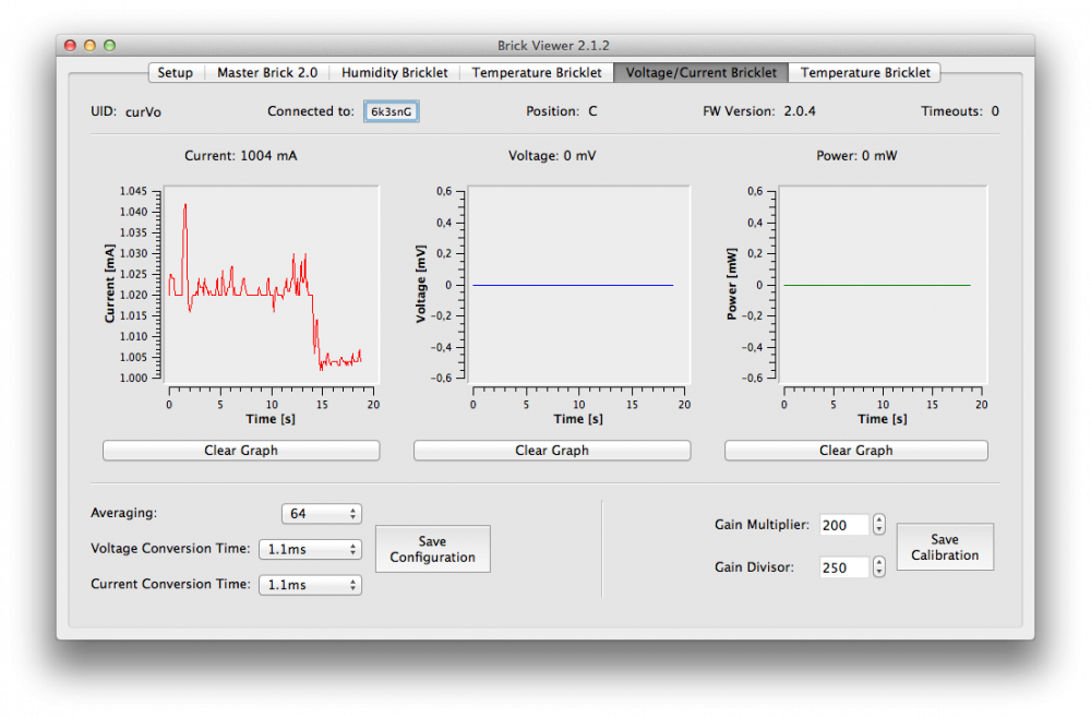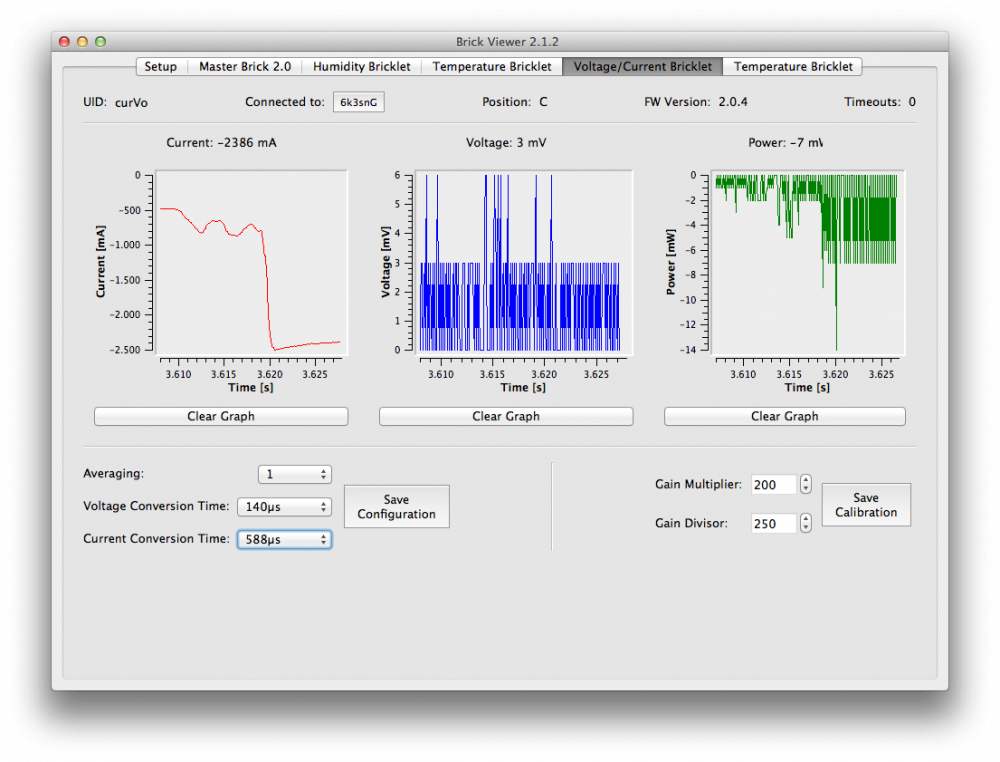 2. @borg: Anbei die Wandlungszeit bei 1.1ms und dann die beobachteten 0mV/0mW. Es liegen jedoch 12V an. Die angezeigten Werte bei der Strommessung passen aber. @tatzemax: Ich habe einen 20Ah Bleiakku und in der Tat, ich habe dass mit den 6A falsch angenommen. Auf der Batterie steht 6A "inital current" und das steht ja für max. Ladestrom zu Beginn. Eine Übersteigerung des Laststroms schließe ich trotzdem aus, da meine Verbraucher in der Summe nicht mehr als 6A ziehen. Mein Laderegler begrenzt die Last auch auf max. 8A und bietet auch einen Kurzschlussschutz an. Wie schon oben beschrieben, hat auch alles wunderbar funktioniert, aber quasi von heute auf morgen misst das Bricklet plötzlich nur noch den Strom!?