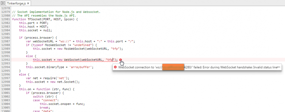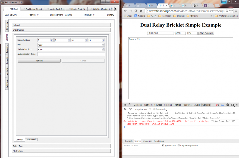Seit dem ich den RED Brick (mit Ethernet Extension) in Verwendung habe, bekomme ich die JavaScript Bindings nicht mehr zum laufen! Zuvor hatte ich einen MasterBrick mit der Ethernet Extension in Betrieb und da gab es keine Probleme. Hab auch auf die neue Version (2.0.4) der JavaScript Bindings upgedatet. Selbst eure Testseiten (z.B. Dual Relay Bricklet) funktionieren bei mir mit dem RED Brick nicht mehr -> siehe Screenshot !!! Habt ihr eine Idee? lg. Günter -
