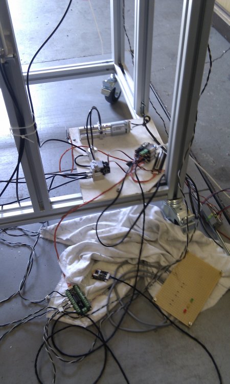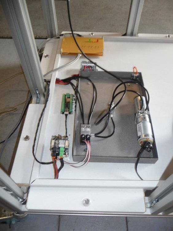 So, hier jetzt die versprochenen Bilder vom aktuellen Stand der Dinge. Der Rechner ist noch nicht drin und die Stromversorgung noch nicht angeschlossen. Die liegende Platine wird noch festgemacht und geht dann ans IO und das Bedienelement. Wir fertigen gerade einen Kasten aus Plexiglas, der dann über die Hydraulik und Elektrik kommt. Dort wird die Platine befestigt und ein Lüfter integriert. So kann niemand direkt reingreifen, aber man kann alles schön sehen. Gibt es hier Erfahrungen mit dem DC Brick und dessen thermischen Verhalten bei Dauerlast? Werde den Motor wohl mit einer Geschwindigkeit von 25K laufen lassen und bei den Kurztests ist der Kühlkörper schon recht heiß geworden. Ich werde zwar einen Lüfter direkt darüber anbringen, würde dennoch gern wissen ob das reicht. Nicht das sich hier nach einer Stunde was entzündet. :'( -