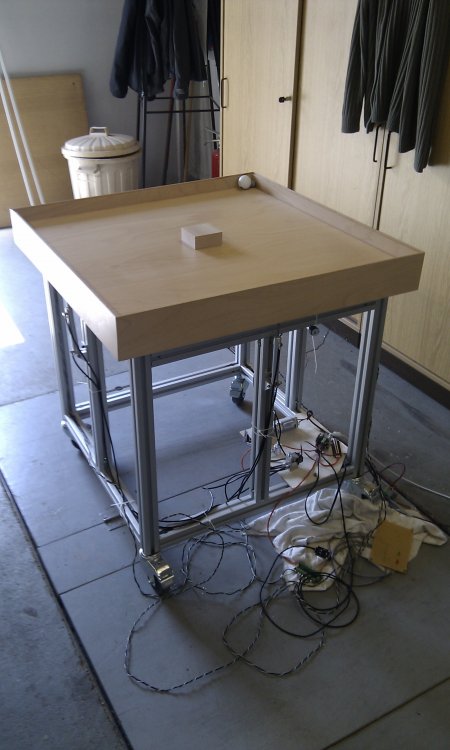 Vor einiger Zeit hab ich mein Projekt ja schon mal angeschnitten, nun werde ich es mal richtig vorstellen. Für eine jährliche Veranstaltung, bei der wir vorallem technische Aspekte der breiten Masse näher bringen wollen, haben wir uns einen kleinen Demonstrator ausgedacht. Sicher ist das Prinzip nichts neues, aber er ist direkt auf unsere Anforderungen ausgerichtet. Dabei handelt es sich um einen kleinen (800x800)mm Tisch auf Rollen, welcher aus zwei Teilen besteht, dem Ober- und dem Unterkasten. Beide sind über ein Kardangelenk beweglich miteinander verbunden. Der Oberkasten kann sich somit drei Dimensional bewegen. An zwei Seiten ist der Ober- und Unterkasten zudem mit kleinen Hydraulikzylindern verbunden, welche die eigentliche Bewegung dieser Ebene ermöglicht. Im Oberkasten wir später ein Labyrinth platziert werden, durch das eine Kugel geführt werden muss. Im Grunde handelt es sich um einen großen Murmeltisch, ähnlich dieser kleinen Spiele die es früher häufiger gab. Im Unterkasten steckt alles was wir für die Realisierung der Bewegungen brauchen. Eine kleine Konstantpumpe mit DC Motor liefert den erforderlichen Volumenstrom für die beiden Aktoren. Geregelt wird dieser Volumenstrom über ein Proportionalventil, deren Position über mit zwei kleinen Servos verändert wird. Zwischen Pumpe und Ventil ist noch ein Filterelement platziert. Nun zur Tinkerforge-Einheit, welche ich mit der Stückliste beginnen möchte. 1x Master 1.1 1x Servo 1.0 1x DC 1.0 1x IO16 1.1 1x TempIR 1.1 1x Linear Poti 1.1 1x Joystick 1.2 Kabel und Befestigungskits An den DC-Brick ist der Pumpenmotor angeschlossen, deren Geschwindigkeit noch über das Linear Poti geregelt wird. Später soll die Geschwindigkeit des Motors Situationsabhängig sein. Der Servo-Brick bestimmt die Position des Proportionalventils (2 Servos). Master bildet logischer Weise die Grundlage für den Stapel. Über das TempIR-Bricklet erfasse ich die Temperatur des Hydrauliköls im Tank. Die Werte werden ausgewertet und über das IO16-Bricklet an eine Temperaturampel weitergeleitet. Das sind drei LEDs, denen ich einen Temperaturbereich zugeordnet habe (Sicherheit). Langzeitversuche haben wir leider noch nicht, darum ist noch unbekannt wie sich die Temperatur des Fluides während des Betriebs entwickelt. Ebenfalls am IO16-Bricklet sind vier Taster angeschlossen, welche die Endlage des Oberkastens erfassen. Ein Taster ist jeweils an einer Ecke angebracht und löst bei Betätigung durch den Oberkasten das Ereignis am IO aus. Die Software sperrt dann diese Bewegungsrichtung und Schäden zu vermeiden. Gesteuert wird das ganze über den Joystick (oben, unten, rechts, links und die Diagonalen). Das Programm läuft auf einem alten Notebook (OS Ubuntu 10.04LTS) und ist in Python geschrieben. Zudem ist noch ein Netzteil im Unterkasten enthalten, welches das DC und Servo Brick versorgt. Vernetzung erfolgt über 15mm Hutschiene mit Wagoklemmen. Hab noch paar Bilder angehangen, leider nur befriedigende Qualität. Da sich aber alles noch im Aufbau befindet reiche ich ordentliche Bilder nach. -