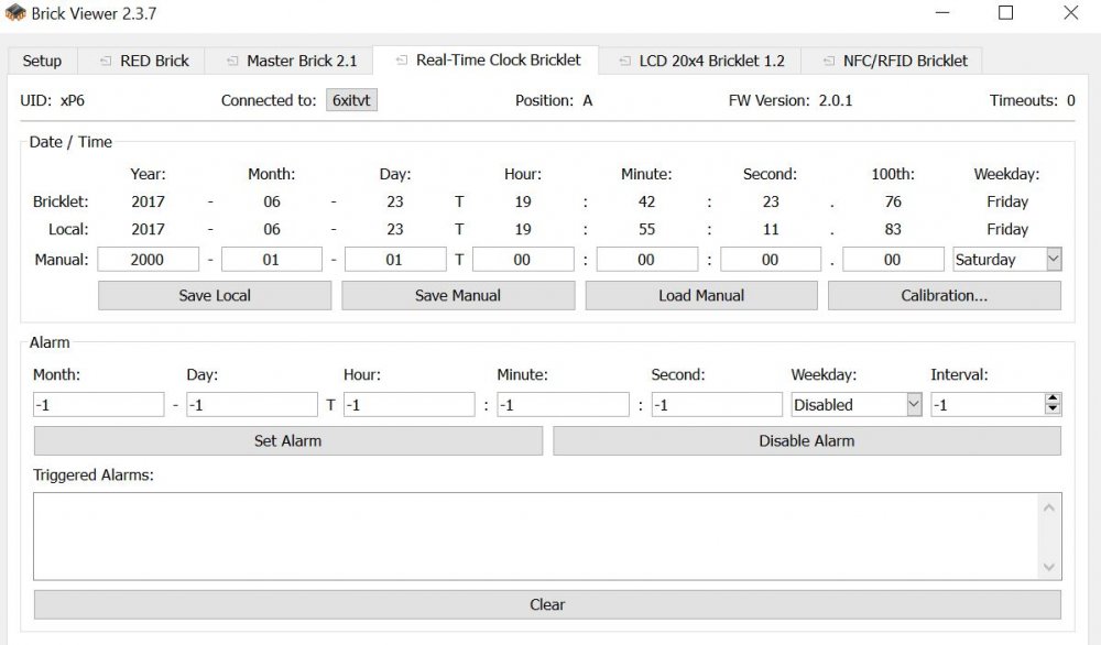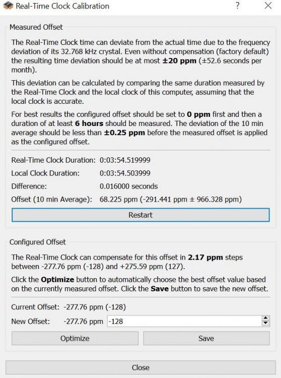 Ja, die Uhrzeit läuft langsam hinterher. Meine AW hat ein wenig gedauert, dafür habe ich jetzt aktuelle Screenshots von meiner RTC. (1) Aktuelle Info, man sieht, dass das Bricklet etwa 13 min nachgeht. Korrekte Uhrzeit ist die local. (2) Screenshot von der Calibration zum Zeitpunkt von Screenshot (1). (3) Screenshot von der Calibration, nachdem ich die local Zeit gesetzt habe. (4) Screenshot von der Calibration, nachdem ich nach (3) auf Restart und die Calibration etwa 4 min laufen ließ. Meiner Meinung nach schaut der Verlauf ja eh nicht schlecht aus - für einen 6 h Lauf hatte ich heute keine Zeit, aber je länger ich laufen ließ, desto kleiner wurde der Offset-Wert. Nur eben: Letztes Mal hielt ich mich an die Anleitung, sprich mit 0 setzen und mindestens 6 Stunde laufen lassen, und trotzdem geht die Uhr dann nach einigen Wochen um einige Minuten hinten. Konfiguriert habe ich bei Raumtemperatur bei mir im Büro, jetzt läuft die Anlage (mit Wetterstations-Gehäuse, also relativ offen da keine Seitenwände verbaut) in einem Betrieb, vielleicht ist die Temperatur ein paar Grad niedriger, aber nicht viel. LGs Stefan