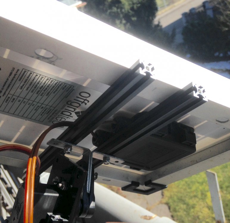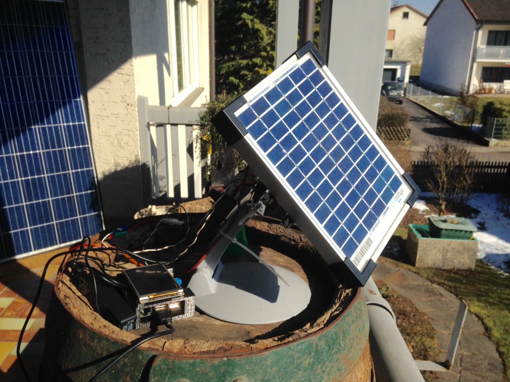Solarmodul per Servo der Sonne nachführen. Material: Servo-Brick, Servo, PV-Modul, Raspberry-Pi Das Programm ist recht einfach gehalten. An Sonenauf-/untergang kann mach noch weiterentwickeln. Die Zeiten im Programm sind für Tests reduziert. Das Poti ist zum manuellen Stellen, z.B. nach Sonnenuntergang ... #!/usr/bin/env python # -*- coding: utf-8 -*- HOST = "localhost" PORT = 4223 UID_servo = "6KveiL" # Change to your UID UID_rotary = "y5A" servo_num = 1 from tinkerforge.ip_connection import IPConnection from tinkerforge.brick_servo import Servo from tinkerforge.bricklet_rotary_poti import RotaryPoti from threading import * from datetime import time, datetime, timedelta ipcon = IPConnection() # Create IP connection servo = Servo(UID_servo, ipcon) # Create device object poti = RotaryPoti(UID_rotary, ipcon) Sonnenzeit = timedelta(hours=10) Sonnenuntergang = time(17, 0, 0).hour Trackzeit = 10 #1800 = halbe Stunde def track(): jetzt = datetime.now().hour Zeit_bis_Untergang = timedelta(hours=(Sonnenuntergang-jetzt)) print("Zeit: {0}".format(str(datetime.now()))) print("Sonnenuntergang: {0}".format(str(Sonnenuntergang))) print("Verbleibende Zeit: {0} ".format(str(Zeit_bis_Untergang)) + " (Std.)") global akt_position servo.set_position(6, akt_position) akt_position = akt_position + 900 t = Timer(Trackzeit, track) t.start() def cb_position(position): #Poti zum manuellen Positionieren servo.set_position(6,60*position) def cb_reached(servo_num, position): #Zielposition erreicht global akt_position print("Position: {0}".format(str(akt_position))) if position == 9000: akt_position = -9000 t = Timer(14, track) #14*3600 Min. bis Sonnenaufgang if __name__ == "__main__": ipcon.connect(HOST, PORT) # Connect to brickd servo.register_callback(servo.CALLBACK_POSITION_REACHED, cb_reached) servo.enable_position_reached_callback() servo.set_velocity(6, 4000) #Geschwindigkeit niedrig servo.set_acceleration(6,8000) #Beschleunigung gering servo.set_position(6, 0) servo.enable(6) poti.set_position_callback_period(50) poti.register_callback(poti.CALLBACK_POSITION, cb_position) global akt_position jetzt = datetime.now().hour if jetzt > Sonnenuntergang: # Nacht Stunden_bis_Start = timedelta(hours=24-jetzt+7) print("Start in {0} Stunden".format(str(Stunden_bis_Start))) t = Timer(Stunden_bis_Start.total_seconds()/3600, track) t.start() # bei Sonnenaufgang starten else: print("jetzt: {0}".format(str(jetzt))) # Startposition anfahren akt_position = 9000-(Sonnenuntergang-jetzt)*1800 #Endposition - Stunden * Winkel/Std. akt_position = -9000 t = Timer(3, track) # t.start() # sofort starten raw_input('Press key to exit\n') # Use input() in Python 3 ipcon.disconnect() t.cancel() -