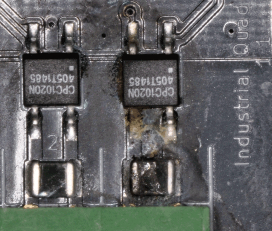 Mit dem Quad Relay steuere ich ein Magnetventil 12 V (920 mA). Nun hat es einen Kurzschluss gegeben (siehe Bild). Könnte das eine Motte gewesen sein? Ist das Quad Relay möglicherweise nicht geeignet für diese Aufgabe? Nun muss eine zusätzliche Absicherung her, da „iqr.get_value()“ in diesem Fall kein brauchbares Ergebnis liefert.