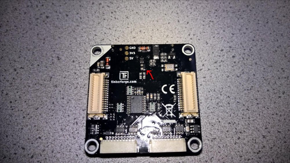 6. Und da sehe ich das Problem auch schon. Ein Bauteil auf der Unterseite sitzt nicht da wo es hingehört. Ich hab es mal mit einem Pfeil markiert. Das Bauteil gehört eigentlich 2mm weiter nach links auf die 4 kleinen Anschlüsse. Das ist eine Spule die in den USB Datenleitungen sitzt. Der Brick bekommt jetzt zwar noch Strom über USB, aber die Datenkommunikation ist tot. Passt exakt zum beschriebenen Problem. Da der Brick geflasht war, muss er noch heile gewesen sein bevor wir ihn verschickt haben und er hat dann den Transport nicht überlebt, sorry. Melde dich mit deiner Bestellnummer und einem Verweis auf diesen Thread hier bei info@tinkerforge.com. Du bekommst einen neuen Master Brick.
