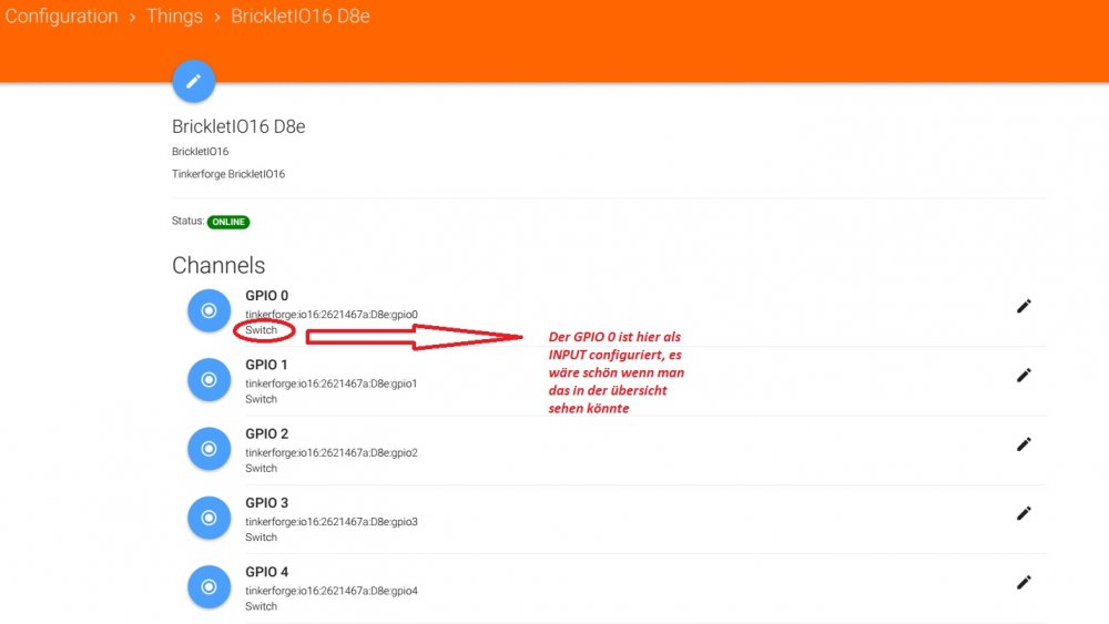 Hallo Theo Super dass Du schon die nächste Binding-Version zum Testen bereitgestellt hast. Ich habe das neue Binding gerade kurz getestet, meine beiden 16-fach IO werden erkannt. Ich konnte die Channel‘s als Switch oder Contact konfigurieren und bei einem kurzen Test hat sich die Switch (mini LED mit 5v/3mA hat sich schalten lassen) als auch die Contact Funktion nutzen lassen. Ich werde das ganze noch mal intensiver testen (baue mir nur eine Tasterleiste ) Theo, Frage ist es möglich in der Paper-UI-View „Configuration / Things / BrickletIO16“ den Text abhängig ob der GPIO es als Switch oder Contact konfiguriert ist, mit „Switch“ oder Contact GPIO (0-15) einzutragen ? (aktuell steht immer Switch, was das überprüfen der Konfiguration schwieriger macht, da man alle anklicken muss um nach zu schauen was sie sind. (siehe Bild) Leider bin ich diese Woche etwas im Stress gewesen und konnte das mit dem rawchannel nicht richtig testen. Ich hab mal rum gespielt und konnte dann doch einen rawchannel mit einem Switch-Item verknüpfen, dann reagriet der Switch im Grunde wie ein Taster. 1x berührt = ein, ein weiteres mal berührt = aus. Ich werde es aber auf jedem Fall ohne Umwege (über Item) mit dem Rules probieren wie es sihui sagte. Eine Sache ist mir jedoch aufgefallen, ich weiß nicht ob es nun am Binding oder am Tinkerforge Masterbrick liegt. Ich habe unter der Woche meine Testkonfiguration umgebaut. Jetzt Stapel1: 2 x Masterbrick und 1x RS485-Extention (hiervon ist ein Masterbrick über USB an den Pi angeschlossen) Stapel2: 1 x Masterbrick und 1 x RS485-Extention (hier wird nur der Masterbrick mit Strom versorgt, die Daten Kommunikation läuft über die Busverlängerung durch das RS485. Stapel-1 und Stapel-2 sind über den RS485 Bricklet verbunden. Test Szenario 1: a) Anschließen des Masterbrick Stapel-1 an den Pi >> der MotionDedector V2 wurde erkannt b) Spannungsversorgung des Stapel-2 angeschlossen >> die Weather und der NFC-Bricklet wurden erkannt. Test Szenario 2: a) "nur" am Stapel 2 wird die Spannungsversorgung deaktiviert >> Weather & NFC Bricklet gehen offline b) am Stapel 2 wird wieder Spannung angelegt >> Weahter & NFC Bricklet bleiben weiter offline Um das ganze wieder zum laufen zu bekommen, musste ich Openhab durchstarten. Wenn ich ohne RS485 Verbindung zwischen beiden Stapeln arbeite und den zweiten Stalpel auch USB an den Pi anschließe, geht beim gleichen Test nach dem wieder einstecken des Stapel-2 Weather und NFC wieder online. (hier ist kein durchstarten notwendig) Wenn ich gleiches Spiel nun BrickViewer mache (also wieder beide Stapel über RS485 gekoppelt und nur Stapel-1 per USB am PC angeschlossen), erkennt der Viewer automatisch nach der Wiederherstellung der Spannungsversorgung die Komponenten des zweiten Stapel (hier wieder mit der Datenkommunikation über den RS485).