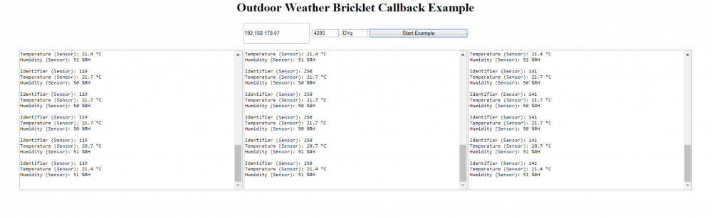 ich habe das Code Beispiel von Tinkerforge in Javascript verwendet um meine drei Temperatursensoren über das Outdoor Weather Bricklet auszulesen.