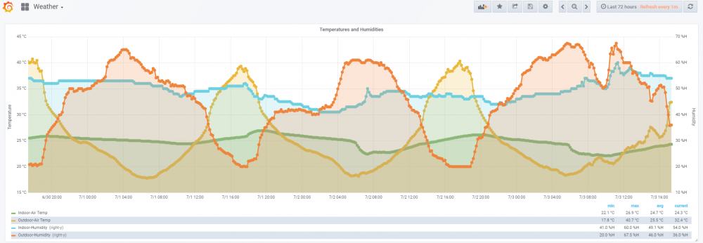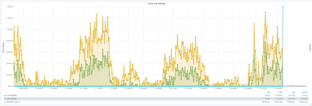 Hallo Richard, vielen Dank für deine Antwort! ja, ich habe mittlerweile eine Differenzbildung für den Regenwert implementiert und bekommen nun Werte für Regen in den letzten 24h und in der letzten Woche angezeigt... Das Zurücksetzen war auch eher für einen "wirklichen" Reset gedacht; nicht für Tages- oder Wochenwerte. Bzgl. der Datenbank: Der eigentliche Hauptthread zur Software ist hier: https://www.tinkerunity.org/forum/index.php/topic,4389.0.html Dort geht es vor allem um die Frage, wie man das ganze als Daemon laufen lassen kann, quasi als Dienst (in Windows-Sprache)... Ich habe mittlerweile die DB gewechselt und benutze InfluxDB, welche explizit für Timeseries-Data gedacht ist (also für Daten, die gegen die Zeit aufgezeichnet werden). ist nicht unbedingt nötig bei diesen Datenmengen, aber ich wollte es eh mal ausprobieren. Zum Darstellen benutze ich Grafana, welche direkt InfluxDB als Datenquelle einbinden kann. Den ganzen aktuellen Code vom Python Daemon findest du direkt hier.. #!/usr/bin/env python3 # -*- coding: utf-8 -*- # Author: NIELS GÖRAN BLUME # eMail: ngblume@gmail.com # DAEMON VERISON HOST = "localhost" PORT = 4223 UID = "Er2" # Outdoor Weather Bricklet ID #InfluxDB access data DB_HOST = "########" DB_USER = "########" DB_PASSWD = "########" DB_DB = "########" from tinkerforge.ip_connection import IPConnection from tinkerforge.bricklet_outdoor_weather import BrickletOutdoorWeather import sys import os import datetime import time import logging import argparse import daemon import signal from pidlockfile import PIDLockFile # Import for InfluxDB connection from influxdb import InfluxDBClient # CONSTANTS # Stations are 10000 + identifier; Sensors are 20000 + identifier !!! info_data = { # Outdoor-001 station 10086: {'last_update': datetime.datetime.now() - datetime.timedelta(seconds=60), 'nodes_id': 1002, 'locations_id': 2002, 'sensors_id': [4003, 4004, 4005, 4006, 4007, 4008, 4009], 'types_id': [3001, 3002, 3003, 3004, 3005, 3006, 3007], }, # Indoor-001 station 20038: {'last_update': datetime.datetime.now() - datetime.timedelta(seconds=60), 'nodes_id': 1001, 'locations_id': 2001, 'sensors_id': [4001, 4002], 'types_id': [3001, 3002], }, } logger, ipcon, ow = None, None, None # Callback function for station data callback def cb_station_data(identifier, temperature, humidity, wind_speed, gust_speed, rain, wind_direction, battery_low): global logger # Get current timestamp ts = datetime.datetime.now() timestamp = ts.strftime('%Y-%m-%d %H:%M:%S.%f') # Correct identifier identifier = 10000 + identifier # Combine all values into a single list values = [temperature/10.0, humidity, wind_speed/10.0, gust_speed/10.0, rain/10.0, wind_direction, battery_low] # Logging logger.info(str(identifier) + " - TS: " + str(timestamp) + " - Data: " + str(values[0]) + "°C, " + str(values[1]) + "%RH, " + str( values[2]) + "m/s, " + str(values[3]) + "m/s, " + str(values[4]) + "mm, " + str(values[5]) + ", " + str(values[6])) # Insert data via sep function insert_values_into_db(identifier, ts, values) # Callback function for sensor data callback def cb_sensor_data(identifier, temperature, humidity): global logger # Get current timestamp ts = datetime.datetime.now() timestamp = ts.strftime('%Y-%m-%d %H:%M:%S.%f') # Correct identifier identifier = 20000 + identifier # Combine all values into a single list values = [temperature/10.0, humidity] # Printing for debugging logger.info(str(identifier) + " - TS: " + str(timestamp) + " - Data: " + str(values[0]) + "°C, " + str(values[1]) + "%RH") # Insert data via sep function insert_values_into_db(identifier, ts, values) # Common shared fuction to insert station as well as sensor data in to DB def insert_values_into_db(identifier, ts, values): global logger global info_data # Format suitable for MySQL timestamp = ts.strftime('%Y-%m-%d %H:%M:%S') # Obtain info for sensor for sensor dict sensor_info = info_data.get(identifier, 'NA') if (sensor_info == 'NA'): logger.info("Unknown sensor in use !!") else: # Check if at least 45 seconds have elapsed since last update to avoid double postings if (ts >= sensor_info.get('last_update') + datetime.timedelta(seconds=45)): logger.info("New data received") # Set up a client for InfluxDB dbclient = InfluxDBClient(DB_HOST, 8086, DB_USER, DB_PASSWD, DB_DB) # Extract lists of sensors and types from sensor_info sensors = sensor_info.get('sensors_id') types = sensor_info.get('types_id') json_body = [ { "measurement": "weather", "tags": { "sensor-type": "Tinkerforge", "node_id": sensor_info.get('nodes_id'), "locations_id": sensor_info.get('locations_id'), }, "fields": { } } ] # Loop over all sensors for i in range(len(sensors)): json_body[0]["fields"][sensors[i]] = values[i] logger.info("Write points: {0}".format(json_body)) dbclient.write_points(json_body, time_precision='ms') # Set new update time as last_update in sensor_data info_data[identifier]['last_update'] = ts logger.info("New entry sent to DB") else: logger.info("Data not new enough !!!") def do_some_work(args): global logger global ipcon global ow # main loop in daemon logger = logging.getLogger(args.daemon_name) logger.setLevel(logging.INFO) fh = logging.FileHandler(args.log_file) fh.setLevel(logging.INFO) log_format = '%(asctime)s|%(levelname)s|%(message)s' fh.setFormatter(logging.Formatter(log_format)) logger.addHandler(fh) # List known stations and sensors logger.info("Listing all known stations and sensors including their node_ids") # print("") for key, val in info_data.items(): logger.info("{} = {}".format(key, val)) # print("") # Open connection to Bricks and Bricklets ipcon = IPConnection() # Create IP connection ipcon.connect(HOST, PORT) # Connect to brickd # Don't use device before ipcon is connected # Connect to Bricklet ow = BrickletOutdoorWeather(UID, ipcon) # Create device object # Enable station data callbacks ow.set_station_callback_configuration(True) # Enable sensor data callbacks ow.set_sensor_callback_configuration(True) # Register stati