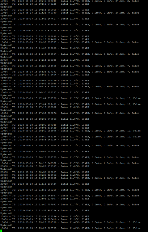 Hallo zusammen, ich bastele gerade aus der Outdoor Weather Station und dem zugehörigen Bricklet eine Wetter-Logging Anwendung. Dabei haben sich einige Fragen ergeben: 1. Beim Erfassen der gesendeten Infos von der Outdoor Wetter Station und dem Indoor Sensor scheint es gerade so zu sein, dass teilweise identische Infos mehrfach ankommen, bzw. mehrere Callbacks auslösen (ungefähr halbe Sekunde verzögert). Das Bild zeigt die Ergebnisse, nachdem ich eine Überprüfung eingebaut habe, ob seit dem letzten Update 45 Sekunden vergangen sind. Nur wenn dies der Fall ist, wird geupdated in der DB ("Updated!")... Liegt dies an mir oder ist das normal und muss User-seitig abgefangen werden? Source-Code in Python basiert auf dem Beispiel und hängt an. 2. Wie funktioniert der Regenmesser? (Tropfen Zähler, oder Gewicht?) Muss man den Zurücksetzen oder setzt der sich automatisch zurück? 3. Ist es normal, dass sich die beiden Stangen gegeneinander verdrehen lassen? Oder habt ihr da einfach eine der Montage-Klemmen direkt drüber gebaut um das Drehen zu verhindern? Danke!! Grüße Niels Göran ==================== #!/usr/bin/env python # -*- coding: utf-8 -*- HOST = "localhost" PORT = 4223 UID = "Er2" # Outdoor Weather Bricklet ID DB_HOST = "****" DB_USER = "****" DB_PASSWD = "****" DB_DB = "****" from tinkerforge.ip_connection import IPConnection from tinkerforge.bricklet_outdoor_weather import BrickletOutdoorWeather import sys import mysql.connector as mc import datetime # Stations are 10000 + identifier; Sensors are 20000 + identifier !!! info_data = { 10086: {'last_update': datetime.datetime.now(), 'nodes_id': 1002, 'locations_id': 2002, 'sensors_id': [4003, 4004, 4005, 4006, 4007, 4008, 4009], 'types_id': [3001, 3002, 3003, 3004, 3005, 3006, 3007],}, # Outdoor-001 station 20038: {'last_update': datetime.datetime.now(), 'nodes_id': 1001, 'locations_id': 2001, 'sensors_id': [4001, 4002], 'types_id': [3001, 3002],}, # Indoor-001 station } # Callback function for station data callback def cb_station_data(identifier, temperature, humidity, wind_speed, gust_speed, rain, wind_direction, battery_low): # Get current timestamp ts = datetime.datetime.now() timestamp = ts.strftime('%Y-%m-%d %H:%M:%S.%f') # Correct identifier identifier = 10000 + identifier # Combine all values into a single list values = [temperature/10.0, humidity, wind_speed/10.0, gust_speed/10.0, rain/10.0, wind_direction, battery_low] # Printing for debugging print(str(identifier) + " - TS: " + str(timestamp) + " - Data: " + str(values[0]) + "°C, " + str(values[1]) + "%RH, " + str(values[2]) + "m/s, " + str(values[3]) + "m/s, " + str(values[4]) + "mm, " + str(values[5]) + ", " + str(values[6])) # Insert data via sep function insert_values_into_db(identifier, ts, values) # Callback function for sensor data callback def cb_sensor_data(identifier, temperature, humidity): # Get current timestamp ts = datetime.datetime.now() timestamp = ts.strftime('%Y-%m-%d %H:%M:%S.%f') # Correct identifier identifier = 20000 + identifier # Combine all values into a single list values = [temperature/10.0, humidity] # Printing for debugging print(str(identifier) + " - TS: " + str(timestamp) + " - Data: " + str(values[0]) + "°C, " + str(values[1]) + "%RH") # Insert data via sep function insert_values_into_db(identifier, ts, values) # Common shared fuction to insert station as well as sensor data in to DB def insert_values_into_db(identifier, ts, values): # Format suitable for MySQL timestamp = ts.strftime('%Y-%m-%d %H:%M:%S') # Obtain info for sensor for sensor dict sensor_info = info_data.get(identifier, 'NA') if (sensor_info == 'NA'): print("Unknown sensor in use !!") else: # Check if at least 45 seconds have elapsed since last update to avoid double postings if (ts >= sensor_info.get('last_update') + datetime.timedelta(seconds=45)): # Extract lists of sensors and types from sensor_info sensors = sensor_info.get('sensors_id') types = sensor_info.get('types_id') # Loop over all sensors for i in range(len(sensors)): data_meas = { 'timestamp': timestamp, 'nodes_id': sensor_info.get('nodes_id'), 'locations_id': sensor_info.get('locations_id'), 'sensors_id': sensors[i], 'types_id': types[i], 'value': values[i], } # Insert into DB try: cursor.execute(add_meas, data_meas) except mc.Error as err: print("Problem while inserting into DB") print("Something went wrong: {}".format(err)) # Make sure data is committed to the database connection.commit() # Set new update time as last_update in sensor_data info_data[identifier]['last_update'] = ts print("Updated!") if __name__ == "__main__": # List known stations and sensors print("Listing all known stations and sensors including their node_ids") print("") for key,val in info_data.items(): print("{} = {}".format(key, val)) print("") try: connection = mc.connect (host = DB_HOST, user = DB_USER, passwd = DB_PASSWD, db = DB_DB) # Connect to DB print("Database connection successful") except mc.Error as e: print("Error %d: %s" % (e.args[0], e.args[1])) sys.exit(1) # Check server version (to test connection) cursor = connection.cursor() cursor.execute ("SELECT VERSION()") row = cursor.fetchone() print("server version:", row[0]) # Define insert object add_meas = ("INSERT INTO meas (timestamp, nodes_id, locations_id, sensors_id, types_id, value) VALUES (%(timestamp)s, %(nodes_id)s, %(locations_id)s, %(sensors_id)s, %(types_id)s, %(value)s)") # Open connection to Bricks and Bricklets ipcon = IPConnection() # Create IP connection ow = BrickletOutdoorWeather(UID, ipcon) # Create device object ipcon.connect(HOST, PORT) # Connect to brickd # Don't use device before ipcon is connected # Enable station data callbacks ow.set_station_callback_configuration(True) # Enable sensor data callbacks ow.set_sensor_callback_configuration(True) # Register station data callback to function cb_station_data ow.register_callback(ow.CALLBACK_STATION_DATA, cb_station_data) # Register sensor data callback to function cb_sensor_data ow.register_callback