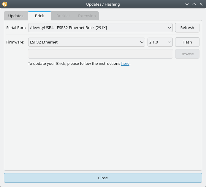 This sentence is worded somewhat misleadingly: ESP32 Bricks (and ESP32 Ethernet Bricks) don't show up as Bricks in the list of connected devices if connected via USB: They still show up in the "Updates / Flashing" window under Bricks: If you (re)flash the ESP32 Ethernet firmware here, this will also do a factory reset.