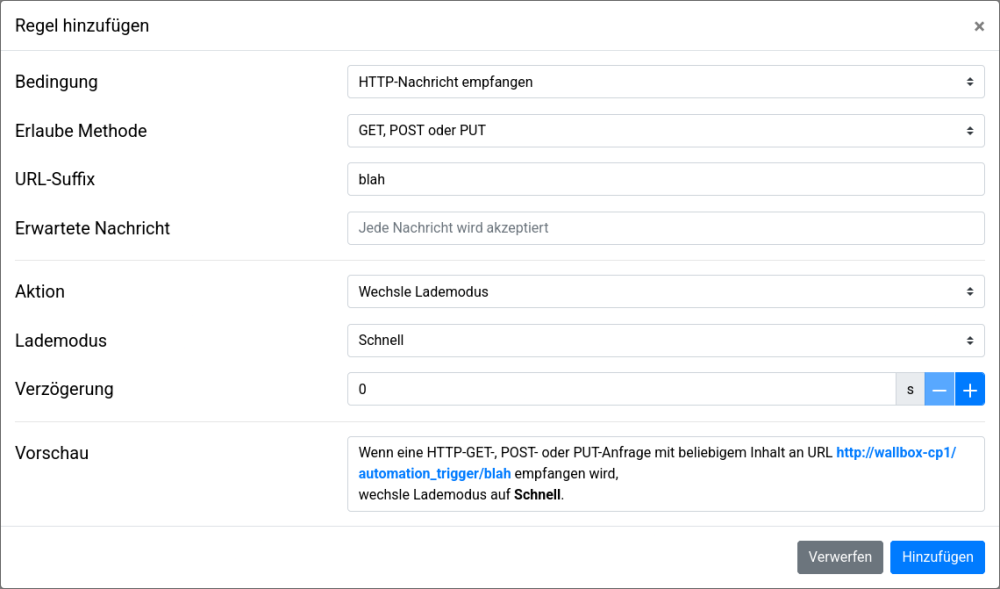 Button heißt in dem Fall der Fronttaster. Du solltest dann noch unter Wallbox -> Einstellungen die Tastereinstellung auf "keine Aktion" setzen. Sonst wird der Ladevorgang beendet wenn du den Taster drückst. Alternativ kannst du als Bedingung der 1. Regel auch folgendes einstellen (blah ersetzen durch was auch immer du willst :D ), dann hast du einen Link den du im Webinterface auch anklicken kannst. -