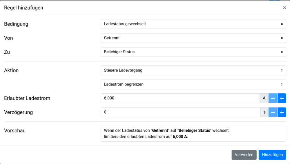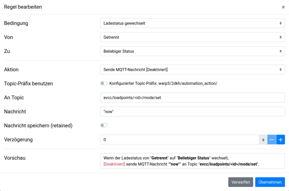 Vielleicht kannst du dich da kreativ raushacken. Eine Idee: Du kannst auf der Wallbox Automatisierungsregeln anlegen und EVCC hat eine MQTT-API (siehe hier https://docs.evcc.io/docs/integrations/mqtt-api#loadpoints). Du könntest also folgendes bauen: - Wenn ein Auto angesteckt wird (das sieht die Wallbox sofort und EVCC mit einer Latenz von bis zu 30 Sekunden), setzt du den Lademodus von EVCC auf Schnell (in der Erwartungshaltung, dass EVCC dann dreiphasig laden wird) - Nach X Minuten (also eine zweite Regel mit der gleichen Bedingung, aber einer Verzögerung von X * 60 Sekunden) setzt du den Lademodus wieder auf PV z.B: Die Namen der Lademodi sind bei EVCC anscheinend nur in der REST-API dokumentiert, hier: https://docs.evcc.io/docs/integrations/rest-api einmal nach /mode suchen. Damit dir das dreiphasige Willkommensladen dann nicht zu viel aus dem Netz zieht, kannst du noch zwei Regeln mit identischer Bedingung anlegen, die den Ladestrom auf 6 A begrenzen bzw. nach X Minuten dann wieder auf 32 A freigeben (das ist ein von EVCC unabhängiges Limit) z.B: Problematisch daran ist, dass es im Moment ein hartes Limit für die MQTT-Automatisierungsregeln gibt, ein Topic darf maximal 32 Zeichen lang sein. D.h die ID des Loadpoints musst du in der EVCC-Konfiguration eventuell zusammenkürzen. -