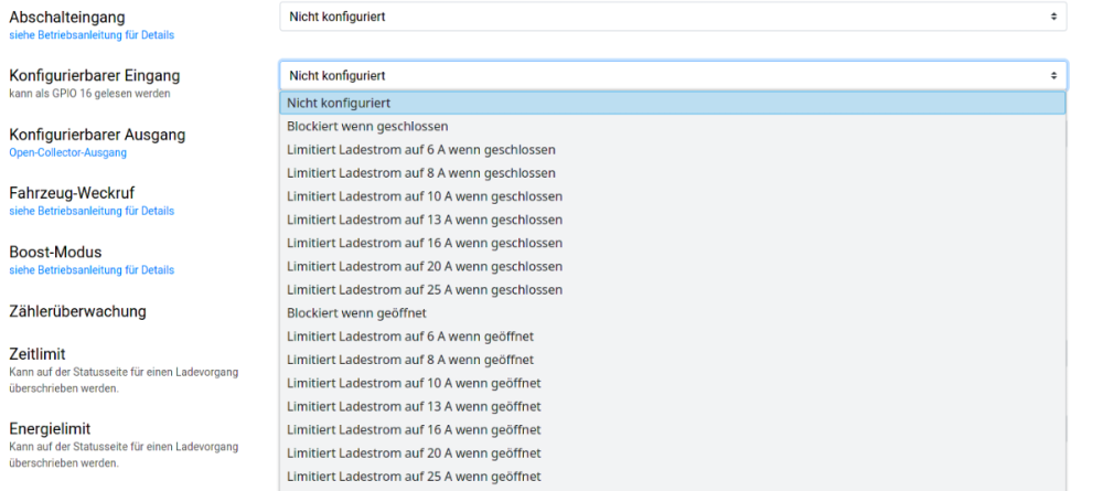 Moin, Das kannst du auf verschiedene Arten umsetzen: Variante 1: Falls die Wallbox relativ weit vom Smart Meter entfernt ist, kannst du den Lastabwurf über einen WARP Energy Manager umsetzen: https://www.warp-charger.com/energy-manager.html Der Energy Manager hat unten am Gehäuse zwei Eingänge, über die du den Ladestrom aller gesteuerter Wallboxen limitieren kannst. Die Kommunikation zwischen Wallbox und Energy Manager läuft übers Netzwerk. Variante 2: Die Wallbox selbst hat am Ladecontroller einen Abschalteingang und einen konfigurierbaren Eingang. Da laut der Vorgaben die Ladeleistung nur anteilig reduziert werden muss, kannst du den konfigurierbaren Eingang verwenden und diesen im Webinterface der Wallbox entsprechend konfigurieren: Die Eingänge findest du am Ladecontroller hier: (grün - konfigurierbarer Eingang, orange - Abschalteingang) Um das Steuerungskabel in die Wallbox zu bekommen musst du ein Loch ins Gehäuse bohren und mit einer Kabeldurchführung abdichten.