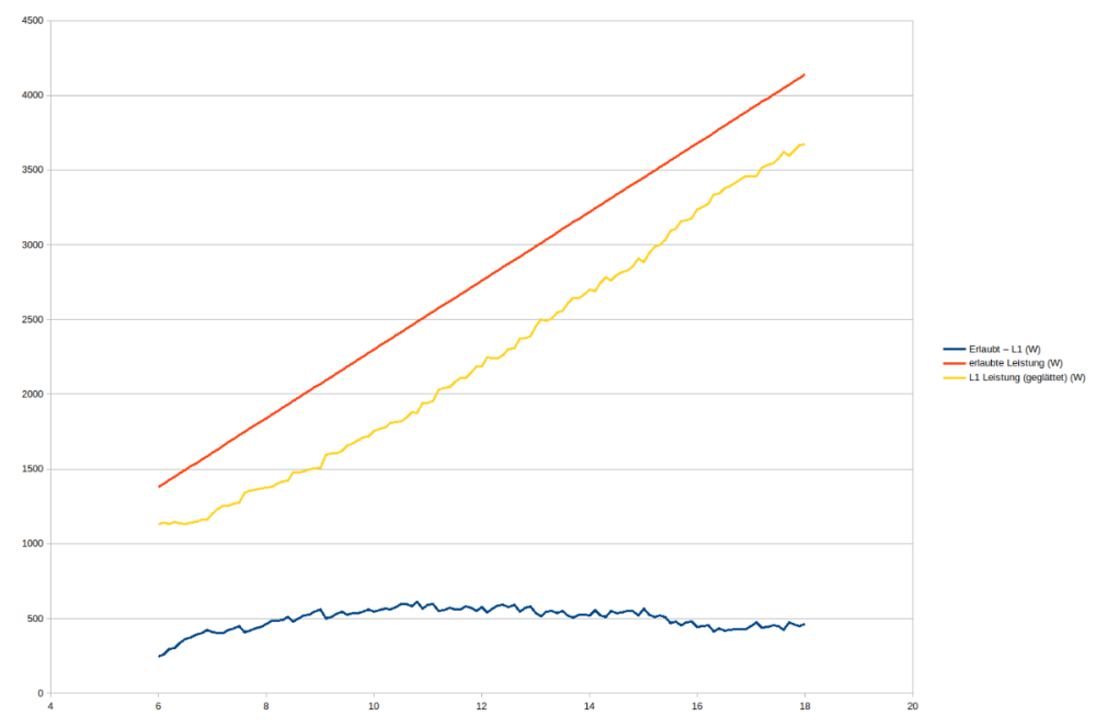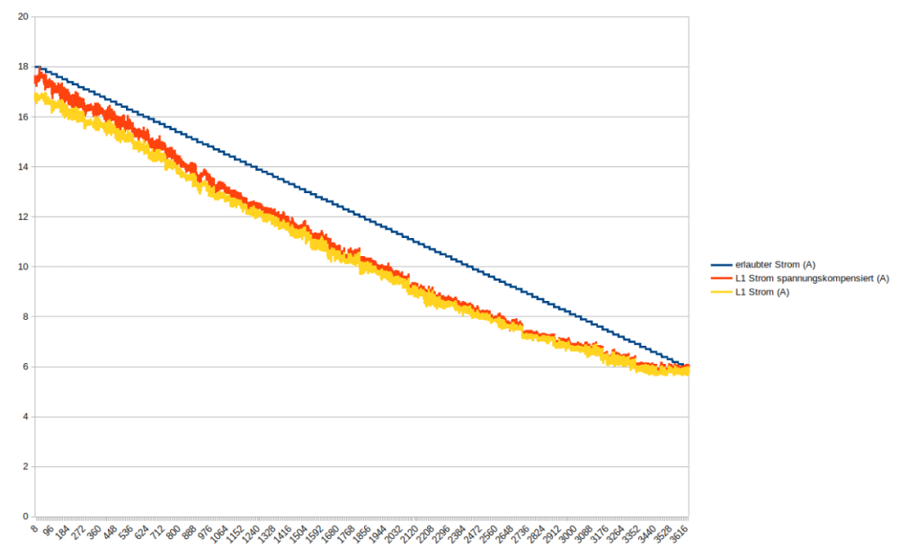 Bei meinem Zoe sieht das z.B. wie folgt aus, wenn man den Bereich von 18 Ampere bis 6 Ampere in 100mA-Schritten abfährt und jeweils 30 Sekunden zum einpendeln lässt: Der spannungskompensierte Strom ist der L1-Strom, aber auf 230V skaliert. In Echt bricht die Spannung beim einphasigen Laden etwas ein, habe ich testweise mal rausgerechnet, um besser das Verhalten des Zoes zu sehen, aber selbst dann wird der Abstand relativ groß. Edit: Auf geglätteten Werten sieht mans besser: Der Zoe lässt immer ~ 500W Luft: (X-Achse ist der erlaubte Strom)