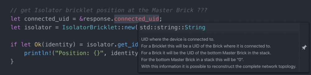 Possibility b) works. Great, thanks a lot for clarifying! So maybe you could add one more sentence into the documentation that the connected_uid - in case a bricklet is connected to an Isolator - is indeed the Isolator and not, as the documentation states, the Brick it is connected to. Again, thanks
