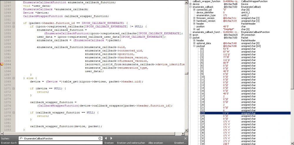 Die Null hat er sofort nach dem Umwandeln in die EnumerateCallback Struktur hab ich gerade herausgefunden. enumerate_callback = (EnumerateCallback *)packet; Ich habe mal von Hand die Daten auseinanderklamüstert. Der Wert steht an der richtigen Stelle. Trotzdem ist er 0. Tante Edit sagt: Ich hab in der ip_connection.cpp mal die Struktur probeweise geändert. typedef struct { PacketHeader header; char uid[8]; char connected_uid[8]; char position; uint8_t hardware_version[3]; uint8_t firmware_version[3]; uint8_t device_identifier; uint8_t enumeration_type; } ATTRIBUTE_PACKED EnumerateCallback; Natürlich ist dann der enumeration_type flasch. War aber nur zum Test.