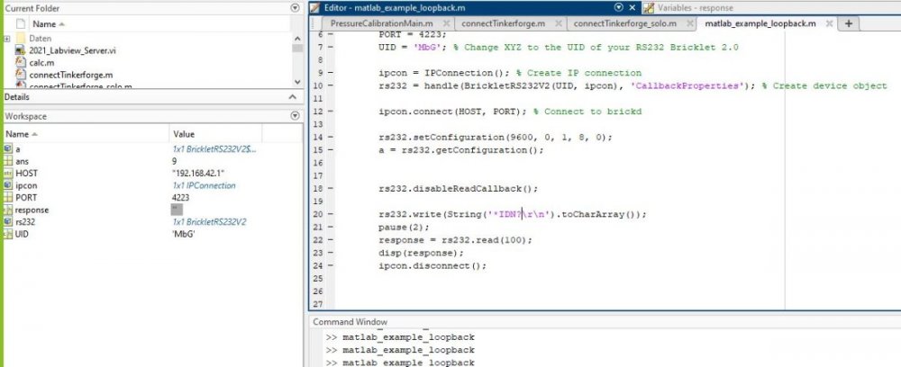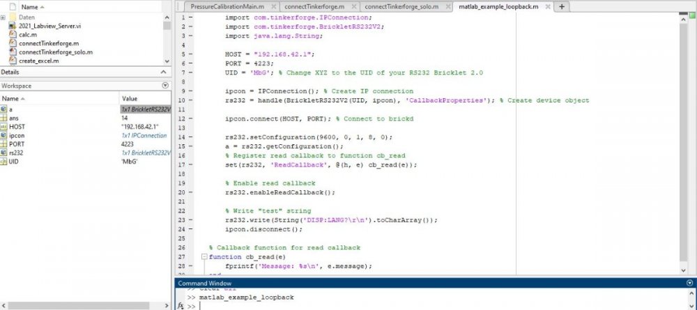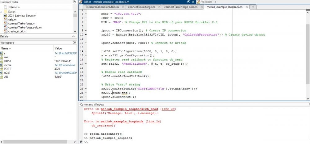 Wenn wir cb_read(e) ausführen wollen, bekommen wir einen Fehler. Wenn wir nur rs232.read(ans) einfügen, bekommen wir zwar keinen Fehler, jedoch ist die zurückgegebene Variable leer.