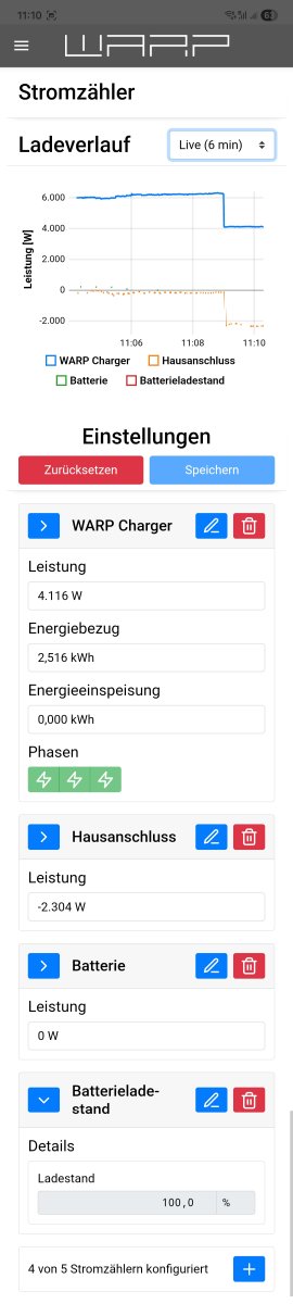 Hi, meine WARP2 betreibe ich in Verbindung mit einer PV-Anklage und einer 5 kWh Batterie. Sämtliche Daten zur Steuerung und Auswertung stehen via MQTT zur Verfügung. In der WARP2 (Firmware 2.9.0) sind folgende Stromzähler definiert welche via API gefüllt/aktualisiert werden. 1) Hausanschluss: Wirkleistung (Bezug minus Einspeisung) 2) Batterie: Wirkleistung (Bezug minus Einspeisung) 3) Batterieladestand: Ladestand in % Der Lademodus ist auf „Min + PV“ eingestellt, mit einer Mindestladeleistung von 4200 W um das 3-phasige Laden sicherzustellen. Regelverhalten „leicht konservativ“ um den Batteriespeicher zu bevorzugen. Bei dem sonnigen Wetters der letzten Tage war das Lade- und Regelverhalten zunächst so wie erwartet: bei ausreichender PV-Produktion wurden das Auto und der Speicher gleichzeitig geladen. Ab dem Zeitpunkt als der Speicher (die 5 kWh Batterie) zu 100% geladen war hat die WARP2 jedoch nicht den Ladestrom für das Auto entsprechend erhöht. Der PV-Überschuss wurde stattdessen ins Netz eingespeist. Der beigefügte Screenshot zeigt diese Situation. Habe ich vielleicht einen Denkfehler, oder die Stromzähler falsch konfiguriert?