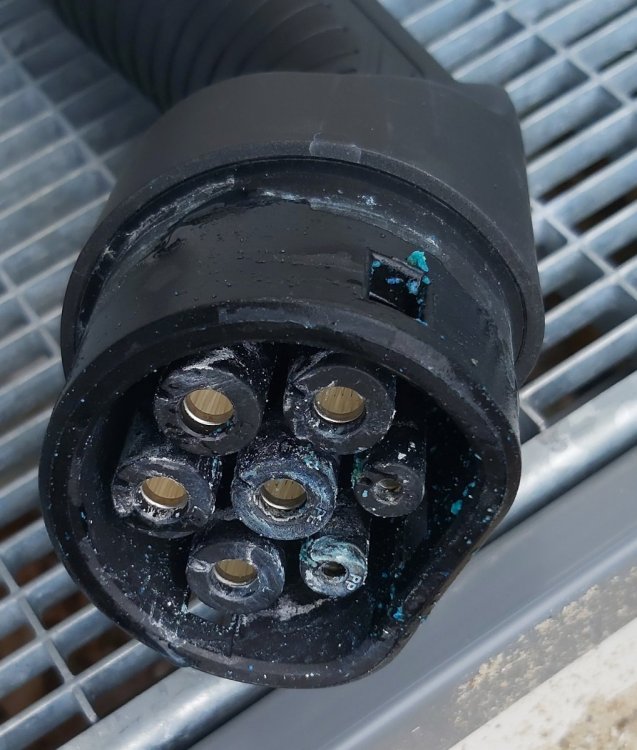 Ich warte immer noch auf meine Lieferung von Kontakt Chemie, daher war die Sache in Vergessenheit geraten. Wir verwenden im Marinebereich druckwasserdichte Steckverbindungen, deshalb die Frage. Aber es scheint zu sein, daß die Kappe nicht (!) sauber genug auf dem Stecker sitzt. Die ist, wenn der Stecker normal nach unten hängt, auch unten und füllt sich wie ein Becher - unten 'drin waren auch einige Tropfen Wasser. Wenn denn der Übergang des Kabels zum Stecker noch dazu bei Regen Wasser durchließe, würde ich mit dem Lieferanten ein Gespräch führen - unter Mitführung eines Baseballschlägers mit langen Nägeln... Kontaktfett wäre eine Möglichkeit, das würde auch diese für Kupfer eigentlich zu blaue Farbe erklären. Ich behalte das nach der Reinigung mal im Auge. -