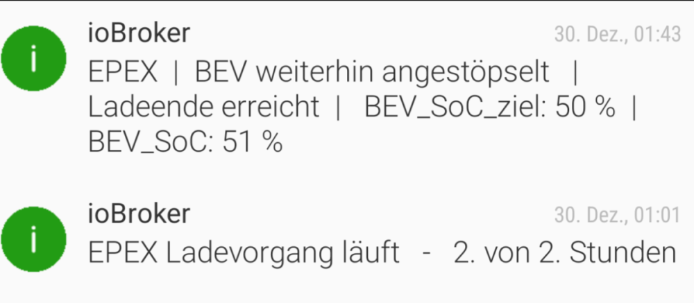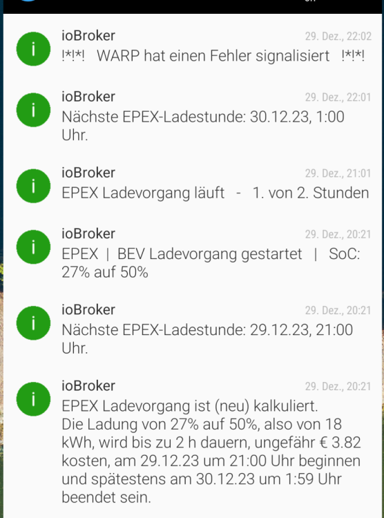 Guten Morgen zusammen. Nachdem ich artig mitgelesen habe, kann ich vielleicht etwas beitragen... Bei den letzten Ladevorgängen passierte es zwei mal, dass die Ladung (11kW EPEX) für ca 30 - 180 Sekunden startete, also die Schütze anzogen und dann der Ladevorgang beendet wurde. Am FZG erfolgte zu dieser Zeit kein Eingriff. Beheben konnte ich dies nur durch einen Neustart der WARP. Auch hatte ich mal die Ladestati zwecks Pushover-Information ausgewertet. Allerdings kam mir die Abfolge der Stati "durcheinander" vor. Deswegen werte ich aktuell nur noch den Fehlerstatus "4" aus. Und dieser tritt sporadisch auf. Gerade heute Nacht, wo zur 21ten Stunde und zur 1ten Stunde geladen wurde. Der ENYAQ war dazu seit ca 2020 angeschlossen. Um 2101 wurde acP auf 11000 W gesetzt, um 2201 auf 0 W, um 0101 wieder auf 11000 und um 0143 war der ZielSoC erreicht, womit acP wieder auf 0 gesetzt wurde. Um 2202 trat der Status "4" auf. Wenn ihr mir genauer sagt, was ich wie und wann an Logs erzeugen soll, unterstütze ich gerne mit allen Informationen. So zum Jahresausklang möchte ich mich bei Euch allen für Euer Engagement und investierte Zeit bedanken. Ich weiß dies sehr zu schätzen und bin froh, dass wir den Umbau auf @mattsches Initiative/Voraussetzungen durchgeführt haben. Sofern wir uns erst im nächsten Schaltjahr "hören", wünsche ich Euch einen tollen Jahreswechsel und alles Gute 🍀👍. Herzliche Grüße, Thomas -
