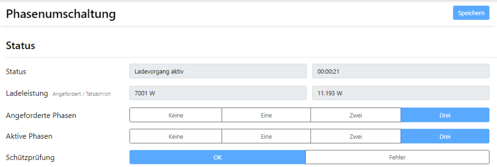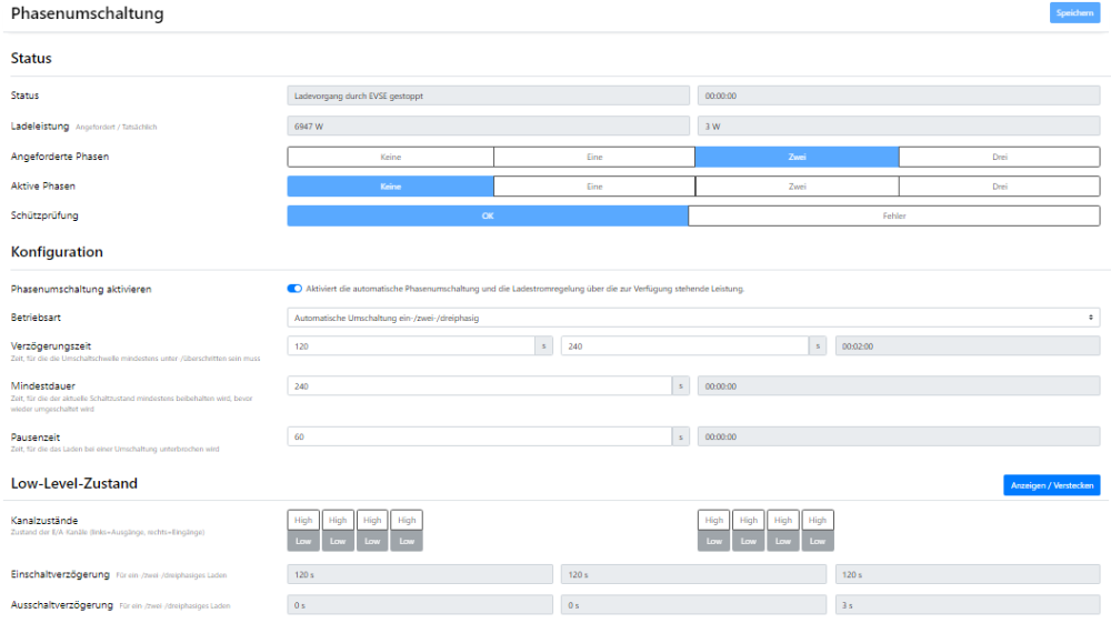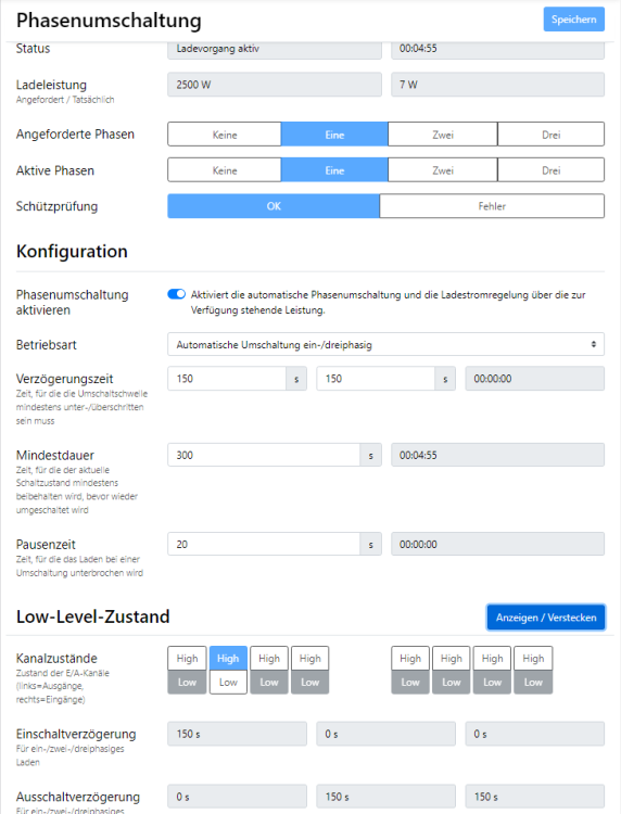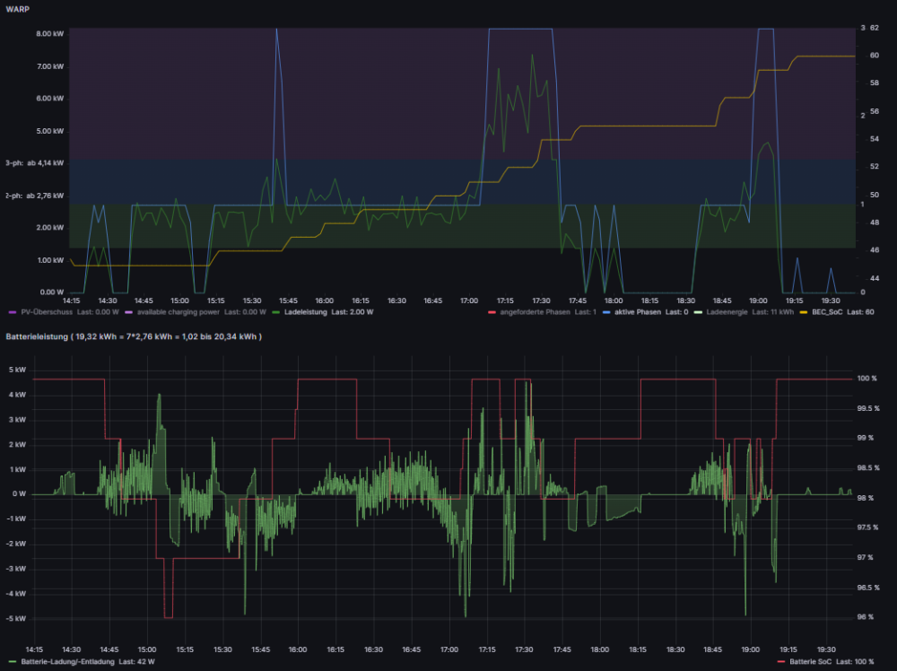 Hallo Zusammen, nun mal 1 Situation, die mich die letzten Tage beschäftigt... Vielleicht könnt Ihr mir Tipps geben, an welcher Stelle ich eine Analyse starten kann. Beginn: Laden mit festen Vorgabewert = 12000W und anschließender Reduzierung auf 7000W ... available_charging_power = 12000 --> Stecker einstecken --> Ladevorgang startet ... Reduzierung der available_charging_power = 7000 --> Auto geht auf rot und in der Warp sieht es wie im Video aus. 2023-07-16_18h31_29.mp4 ... deaktiviere ich AUTOSTART --> stoppe über den Button --> geben dann vorgeschlagene 10.149A frei --> und starte den Ladevorgang über den Button --> beginnt der Ladevorgang direkt problemlos ... sende ich die available_charging_power = 7000 erneut, bricht der Ladevorgang direkt wieder ab... Dazu noch eine Frage? Ab wieviel W schaltet der PhaseSwitcher von 1- auf 3-phasig und wieder zurück? Danke Euch und Gruß, Thomas -