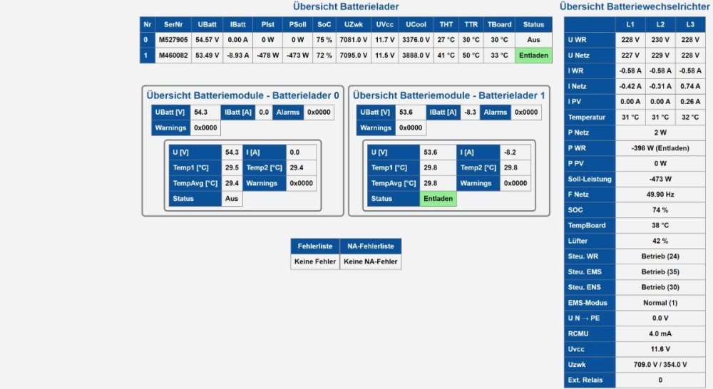 Ich meinte euren Energy Manager. Varta kann glaube ich Sunspec. EVCC ließt über den Speicher die Strom und Spannungswerte aus wie genau das EVCC macht weiß ich nicht. Ich habe das jetzt so verstanden das es zwingend nötig ist. den Energy Manger von euch zu haben um die Phasen Abschaltung zu Realisieren.. Ich weiß nur wie ich an die daten gekommen bin: Zeit = "18.09.2023 18:59:18"; WR_Data = [0,-4000,4000,0,-445,232,228,229,0,0,0,231,228,228,-56,-55,-56,31,32,32,38,499,0,1,3,0,"255.255.255.255",40,116,710,354,45,24,30,35,1,-445,1611663243,1074286086,0,0,0]; EMETER_Data = [4996,0,229,228,228,-59,-26,82,-88,-95,-107,-105,-101,134,0,0,39,38,39,-15,0,0,0]; ENS_Data = [4996,229,228,228]; Charger_Data = [[0,1,75,0,5457,0,7083,3373,117,26,30,28,0,0,0,0,0,0,1128759296,32771,6,19731,23,64,77,75,20,5,1860,44, ["LG_Neo",7,0,0,5430,0,740,940,581,63,63,296, [[24576,0,0,0,0,0,740,941,543,0,3879,3889,3885,63,63,3426,3426,296,295,295,0,579,600,564,444,0,1904048202,3239442,744,733,"0.7.0.21",3878,3884,3883,3889,3888,3887,3886,3884,3887,3881,3883,3886,3884,3889] ] ] ] ,[1,1,74,72,5386,-815,7097,3915,115,41,51,33,-445,0,0,0,0,0,1137147904,32843,6,19731,21,4,80,75,20,5,1860,1860, ["LG_Neo",5,0,0,5400,-82,730,940,581,31,31,298, [[24577,0,0,0,0,0,732,942,540,-83,3854,3865,3858,31,31,1701,1701,298,297,297,0,631,600,565,439,0,1905278088,1734589,739,727,"0.7.0.21",3855,3860,3860,3860,3857,3855,3855,3854,3857,3858,3860,3861,3865,3858] ] ] ] ]; -
