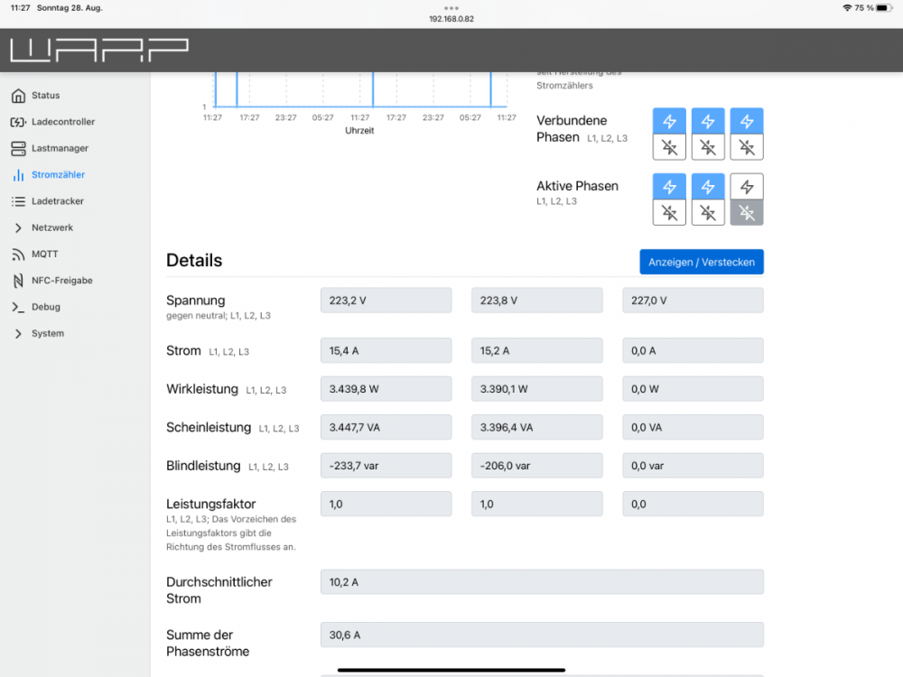 2. So, gerade lädt mein Auto mit der neuen Firmware. Leider immernoch „nur“ mit 6,8 kW. Das ist jetzt kein Drama, ich war halt nur verwundert, dass ich an einer Hotel-Wallbox mit 7,2 KW laden konnte. Anbei die angezeigten Werte. Der Maximalstrom war mit 16A vorgegeben.