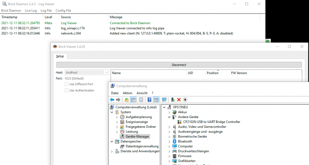 Hi, bei meinen Softwareumbauten (Phasenumschaltung) habe ich es durch meine jüngste Änderung geschafft, die Firmware so zu schrotten, dass das Webinterface nicht mehr hochkommt (FUBAR - fucked up beyond all recognition ;-) ). Nach Abziehen der zusätzlichen Bricklets (ich schalte meinen Code nur scharf, wenn die gefunden werden) konnte ich die Kiste wieder erreichen - puh. Ich habe also keine unmittelbare Not mehr. Aber: Ich konnte und kann den ESP32-Brick nicht im Brick Viewer finden. Erst habe ich es in der Ubuntu-VM probiert, dann auch direkt auf meinem Windows Host. Alles installiert, Rechner zwischenzeitlich auch neu gestartet - findet nichts. Im Geräte-Manager taucht der CP2102N auch als unbekanntes Gerät auf. Scheint, als habe es bei der Treiberinstallation ein Problem gegeben oder als sei kein Treiber mit installiert worden. Im brickd Log finden sich auch entsprechende Einträge. Habt ihr eine Idee, was ich tun kann? Wie gesagt, ich habe keine unmittelbare Not. Man kann sagen, ich hatte Glück, dass meine Setup-Routine greift. Aber es beunruhigt mich, brickv aktuell nicht als Rückfalloption für ein Zurücksetzen zu haben, wenn dieser Weg mal nicht funktionieren sollte. Vielen Dank schon mal! brickd.log -
