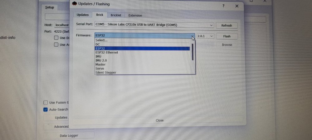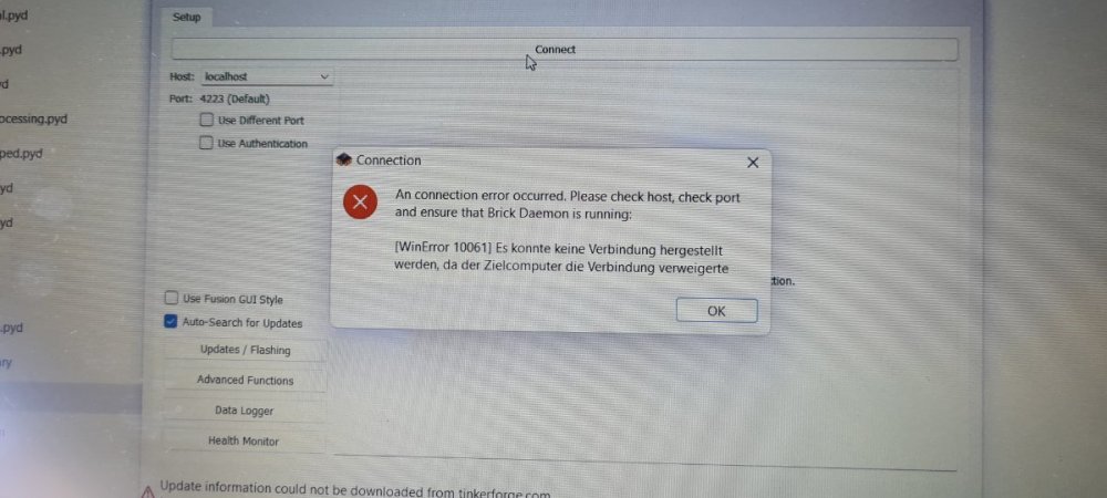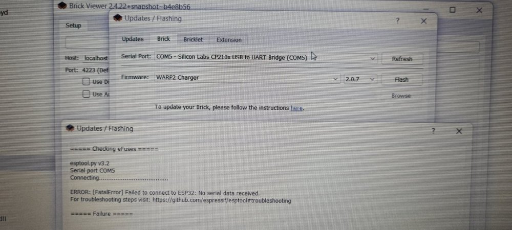 Wenn ich schon am löchern bin... Gibt es den eine Anleitung zum flashen. Hab mich da mal durchgeklickt(hab natürlich nix geändert) und wenn ich das BrickViewer von euch öffne und Connect anklicke kommt diese Fehlermeldung (Bild1). • Wenn ich auch ohne Connect auf Updates/flashing gehe, dann auf Brick ... kommt zwar der Serial Port: COM5-Silikcon Labs CP210xUSB to UART Bridge (COM5)......da müsste ich doch ESP32 unter Firmware auswählen,oder? Wundere mich deshalb, weil nur die Version 2.0.1 angezeigt wird (Bild2)....wie bekomme ich hier die neuste Firmware 2.0.7 rein? Sorry ,für die echt vielen Fragen....hab da echt kein Plan -