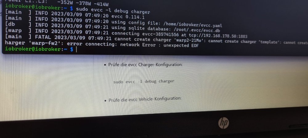 Guten Morgen zusammen, nachdem ich mich gestern an EVCC(nach Anleitung) gewagt habe sind dann folgende Fehler aufgetreten. Das ganze wurde auf einem Raspberry Pi3B auf iobroker installiert. 1.)Hab die IP von dem PI in der WARP2 unter MQTT ( bei Broker-Hostname oder -IP-Adresse) eingetragen. Leider verbindet er sich nicht. Muss ich noch etwas zusätzlich eintragen? 2.)Bei EVCC gibt es keinen SMA Wechselrichter STP 10.0......was trage ich dann ein? 3.)Bei EVCC wird mir die VIN (Tesla) nicht erkannt...obwohl VIN Eingabe stimmt. 4.) Wie ändere ich in EVCC nachträglich Eintragungen? Bin leider in dem Thema gar nicht so drin....bitte um Hilfestellung