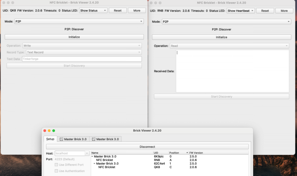 4. Hi, We experienced an issue with the latest firmware (2.0.6) for card emulation. Scenario 1 No communication possible between NFC Bricklet and Smartphone The bricklet is not detected by a smartphone or by another bricklet in reader mode. (In the previous version, we got “Card Emulator: Transfer NDEF error” frequently (reading with an Android phone and another bricklet) but it was doable.) Scenario 2 No NFC communication possible among NFC Bricklets. One nfc bricklet in reader mode (e.g. attached to a raspberry pi), another nfc bricklet in card emulation mode (e.g. attached to a computer which will select the tag to emulate). I have tried to have the first bricklet in reader mode (NFC type 4 with NDEF) and the other in card emulation mode with some text (both connected to the same master brick to a computer for now). With version 2.0.5, I can successfully “Scan for Tag” on the reader but not read any page: I get “Card Emulator: Transfer NDEF error” on the emulator. With version 2.0.6, I’m unable to detect the emulator from the reader at all. Scenario 3 No NFC communication possible among NFC Bricklets in P2P Mode. I have also tried to use P2P mode (one reader, one writer), but there is neither discovery nor communication. Could you please assist me on this issue? My environment use Brick Viewer 2.4.20 for MacOS; Master Brick with firmware 2.5.0 Best regards, Paul