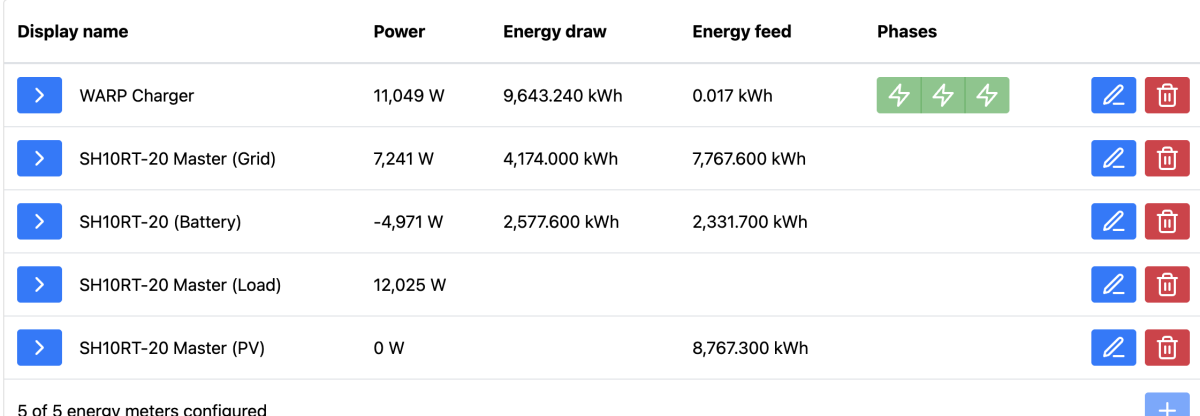 Hallo zusammen, vorab schon mal ein "Sorry" für die Länge der Anfrage :-) ich nutze einen WARP2 Charger und evcc (als Home Assistant Addon) zur Steuerung des PV-Überschuss-Ladens. Da evcc zwar schick ist, bei einem Auto und einer aktiv genutzten WB aber irgendwie Overkill, wollte ich das komplett über den WARP2 machen und habe mir die Einstellungen der Stromzähler angesehen und gemerkt, dass die Werte vom Netzanschluss im Home Assistant nicht mit der Info im WARP2 übereinstimmen. Nach ein paar fehlgeschlagenen Versuchen der Konfiguration vermute ich inzwischen, dass die ModBus-Register für die Integration der Sungrow-Zähler in die WARP2 nicht richtig/optimal sind. Während eines Ladevorgangs mit 11 kW würde ich bei den Werten des Stromzählers Grid (DSU666 über Sungrow SH10RT-20 WR) im WARP2 erwarten, dass die gesamte vom Grid bezogene Power angezeigt wird - also inkl. des Netzbezugs für das Laden. Dem ist aber nicht so: Konfiguration: Laut https://github.com/Tinkerforge/esp32-firmware/blob/master/software/src/modules/meters_modbus_tcp/sungrow.py nutzt Ihr folgende ModBus Register für die Grid-Werte: Für die Einbindung der Sungrow-Wechselrichter in HA (ich habe zwei, nur der Master speist aber über PV oder Akku ins Hausnetz ein) nutze ich die Integration von mkaiser (https://github.com/mkaiser/Sungrow-SHx-Inverter-Modbus-Home-Assistant). Dort werden folgende ModBus-Register für die Active Power die am DSU666 ausgelesen werden verwendet (https://github.com/mkaiser/Sungrow-SHx-Inverter-Modbus-Home-Assistant/blob/main/modbus_sungrow.yaml). Die Register 5083, 5085, 5087, 5089 kommen in der HA-Integration gar nicht vor. Habe ich da einen Denkfehler, was die Integration der Stromzähler in WARP2 angeht? Danke und Gruß Sebastian