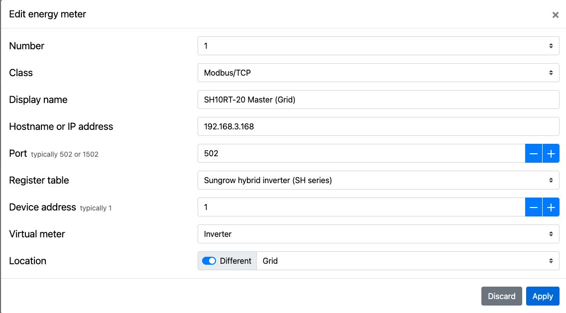 Der DTSU666-Stromzähler ist mit "Messklammern" (je eine Messklammer je Phase) an der Zuleitung vom Stromzähler des Netzbetreibers angeschlossen. Der Wechselrichter wiederum ist mit RS485 an den DTSU666-Stromzähler angeschlossen. Den Stromzähler des Netzbetreibers lese ich momentan gar nicht aus, werde das jetzt bei Gelegenheit einrichten, um Vergleichswerte zu haben.