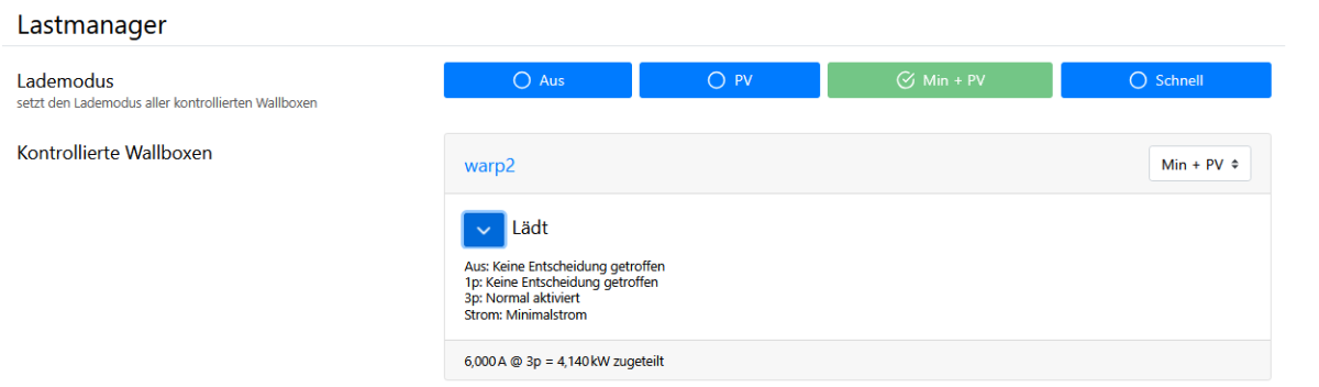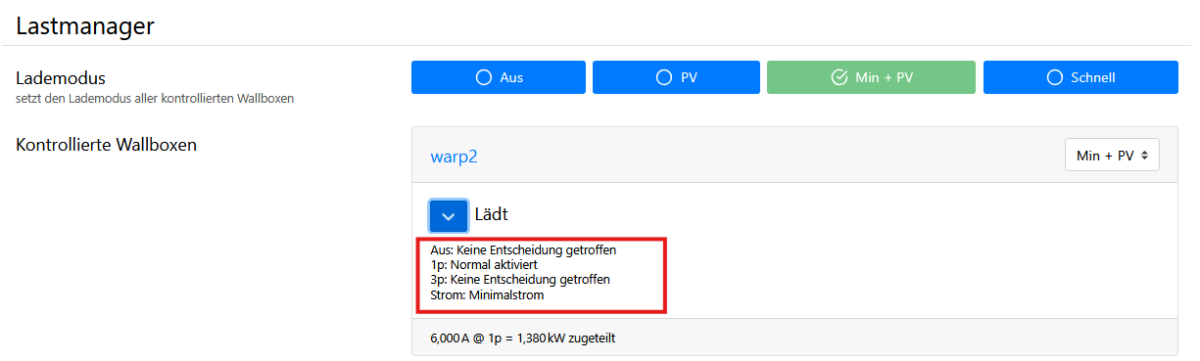 Damit habe ich das Lastmanagement aktiviert und auch mal PV-Überschussladen, obwohl heute nicht viel kommt (stark bewölkt). Dann sieht das so aus: Was bedeutet das "3p: keine Entscheidung getroffen"? Laden tut das Auto aber mit 3p 6A also 4 kW:
