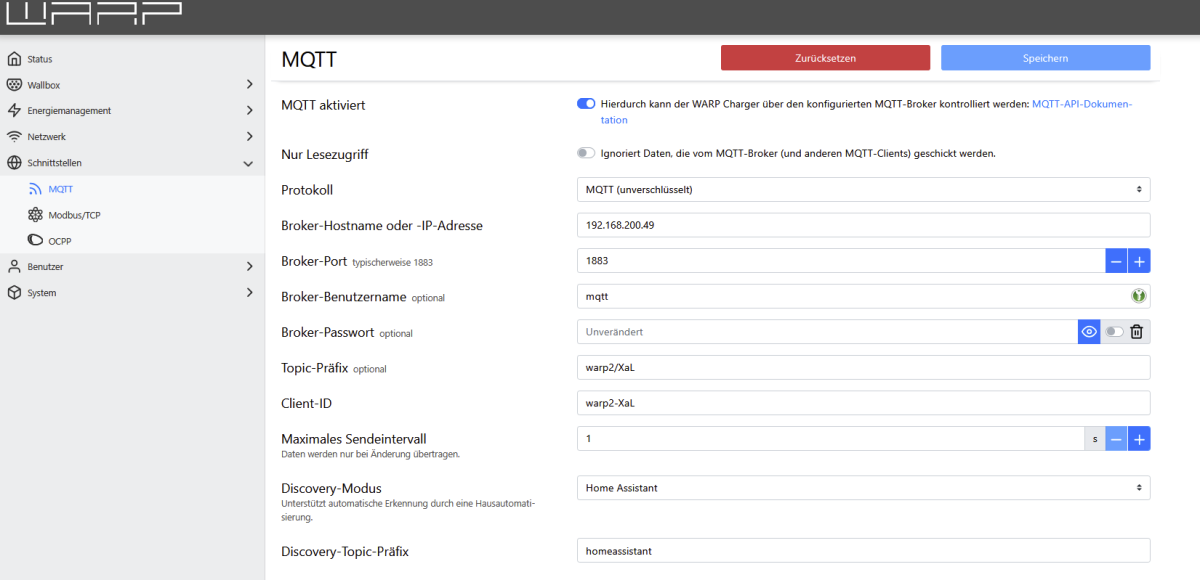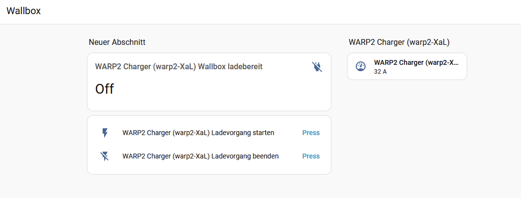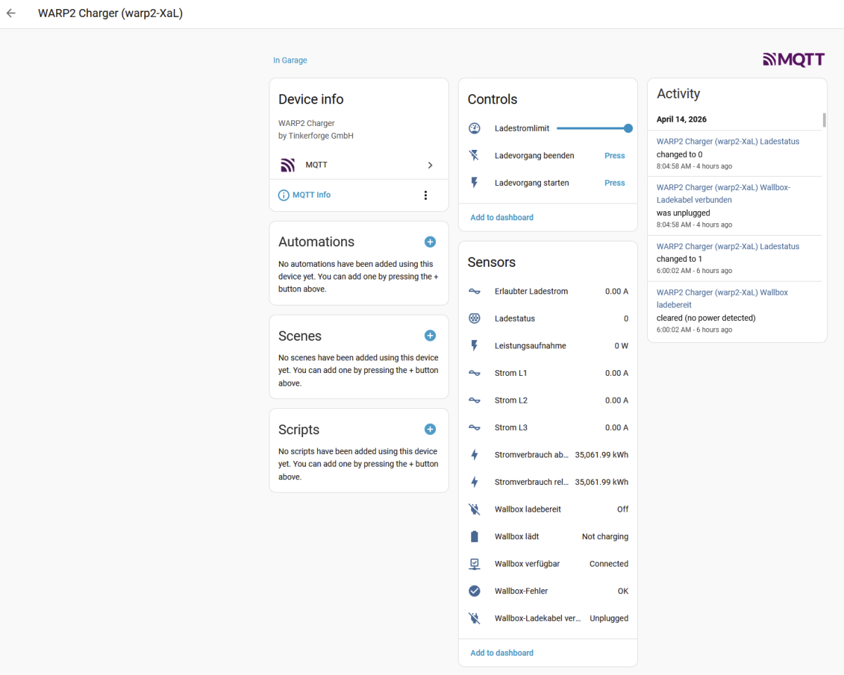 Ich mag mich täuschen ... aber unwahrscheinlich. Aber meine WARP2 hat eine MQTT-Schnittstelle incl. Auto-Discovery und es hat vor ein paar Tagen auch sauber funktioniert, die zu aktivieren. Ich sah die dann automatisch in Home Assistant. So sieht es in HA aus: Da kann man nun Dashboards damit bauen usw. aber das habe ich noch nicht weiter verfolgt, nur mal kurzer Test/Versuch: