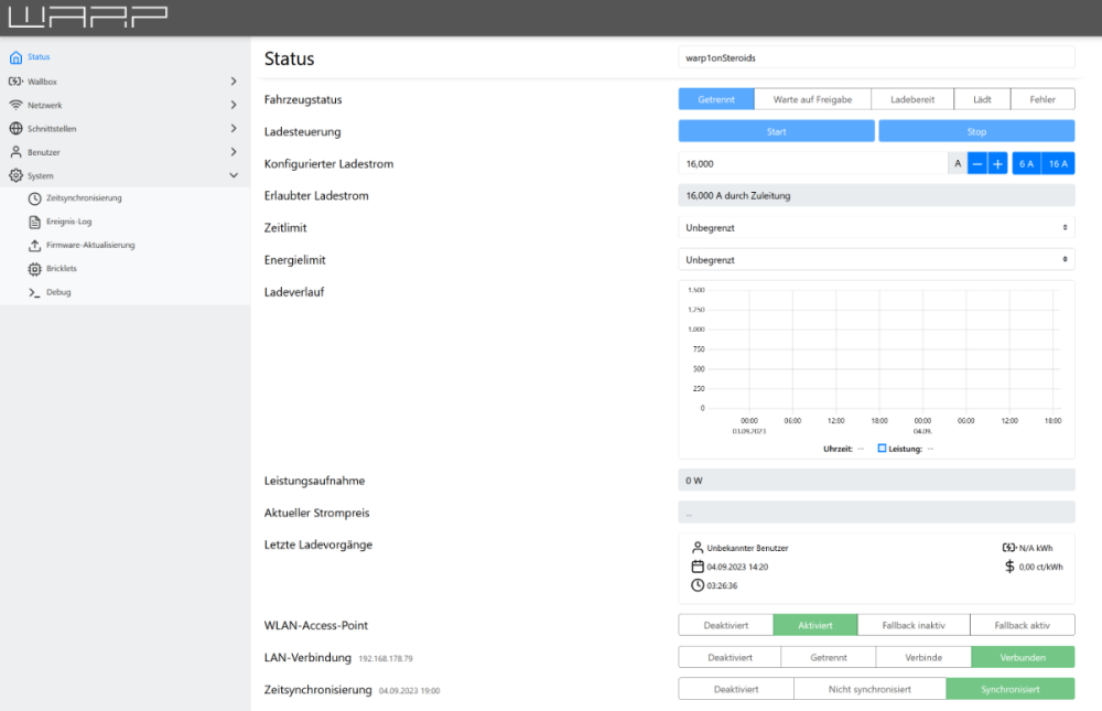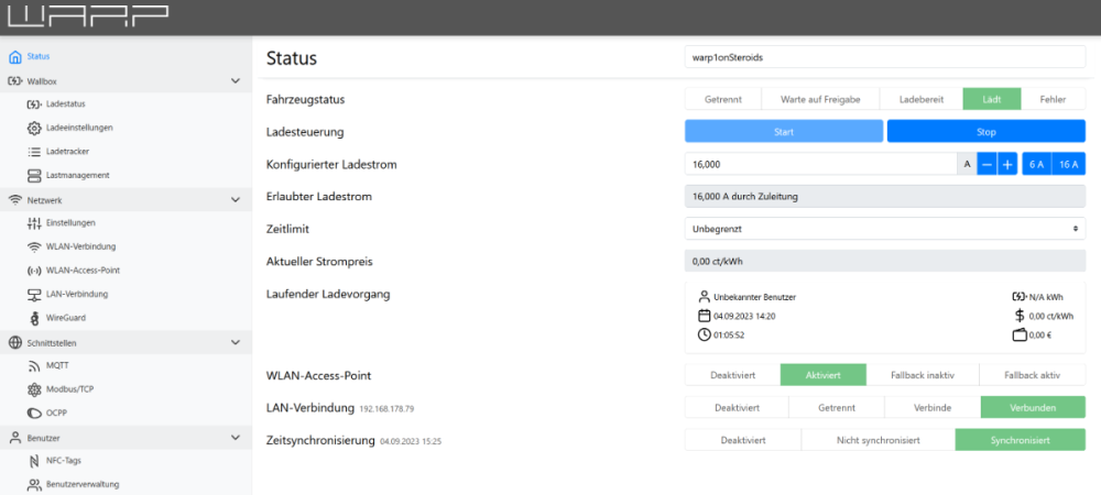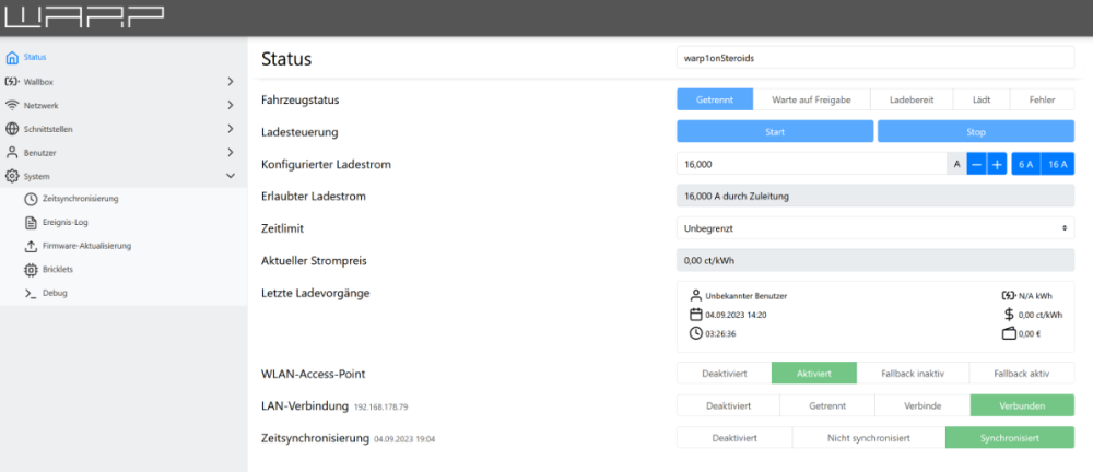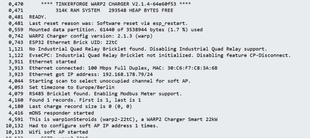 Hallo Thomas, ich habe die Firmware aufgespielt auf meinen "Warp on Steroids Pro". Er zeigt mir bei den angeschlossenen Bricklets an Port A allerdings ein unbekanntes Gerät TS7 an... Es wird erkannt, dass kein Industrial Quad Relay vorhanden ist und die Unterstützung wird disabled. Soweit so gut. Kann es aber sein, dass in der Firmware der Zähler nicht enthalten ist / nicht erkannt wird, da du eine Smart Variante hast und ich eine Pro Variante habe? Es wird bei mir auch kein kWh angegeben und keine Ladeverlaufskurve dargestellt. Jetzt noch eine allgemeine Frage: Ich habe einfach mal die verbauten Elemente bei mir (nächstes Bild) und beim Warp2 (siehe 2. Bild => vom Internetauftritt). Sowohl Schütz als auch Zähler scheinen die gleichen zu sein. Meine verbauten Elemente: Beim Warp2 verbauter Schütz und Zähler sind gleich: Ich habe den gleichen ESP, den gleichen Schütz, den gleichen Zähler, den gleichen NFC Brick, wo sind da jetzt noch die Unterschiede zum Warp2. Ist das nur noch das EVSE Bricklet? Hätte ich, wenn ich das dann noch umbaue im Prinzip eine vollwertige Warp2 auf der ich die Standard Firmware einsetzen kann? Viele Grüße Oliver -