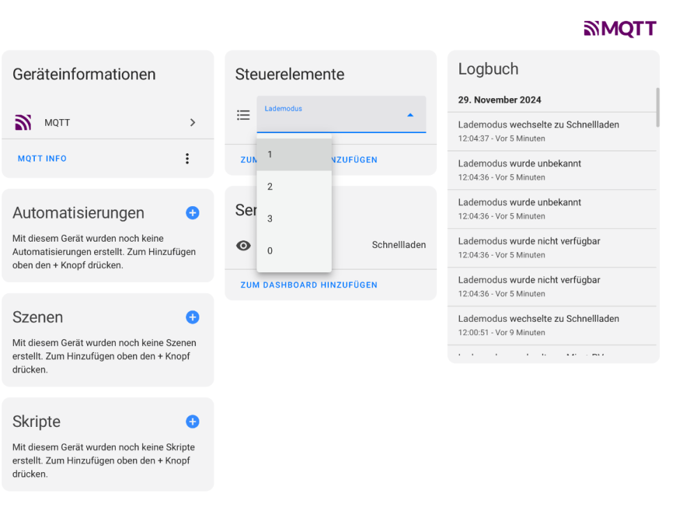 Hallo, ich konnte es fixen. Der folgende Code funktioniert, falls jemand das gleiche haben möchte: # MQTT Sensoren: Informationen zum Power Manager mqtt: sensor: - name: "WARP Energy Manager" unique_id: "warp_energy_manager" state_topic: "wem/26JT/energy_manager/config" value_template: "{{ value_json.enabled }}" device: identifiers: ["warp_energy_manager"] name: "WARP Energy Manager" manufacturer: "WARP" model: "Energy Manager" sw_version: "1.0" - name: "Lademodus" icon: "mdi:ev-station" unique_id: "warp_lademodus_state" state_topic: "wem/26JT/power_manager/charge_mode" value_template: > {% set mode = value_json.mode %} {% if mode == 0 %} Schnellladen {% elif mode == 1 %} Aus {% elif mode == 2 %} PV {% elif mode == 3 %} Min + PV {% else %} Unbekannt {% endif %} device: identifiers: "warp_lademodus" select: - name: "Lademodus" unique_id: "warp_modus_select" state_topic: "wem/26JT/power_manager/charge_mode" command_topic: "wem/26JT/power_manager/charge_mode_update" command_template: > {% if value == "Aus" %} 1 {% elif value == "PV" %} 2 {% elif value == "Min + PV" %} 3 {% elif value == "Schnellladen" %} 0 {% endif %} icon: "mdi:ev-station" value_template: > {% set mode = value_json.mode %} {% if mode == 0 %} Schnellladen {% elif mode == 1 %} Aus {% elif mode == 2 %} PV {% elif mode == 3 %} Min + PV {% else %} Unbekannt {% endif %} options: - "Aus" - "PV" - "Min + PV" - "Schnellladen" device: identifiers: ["warp_lademodus"] -