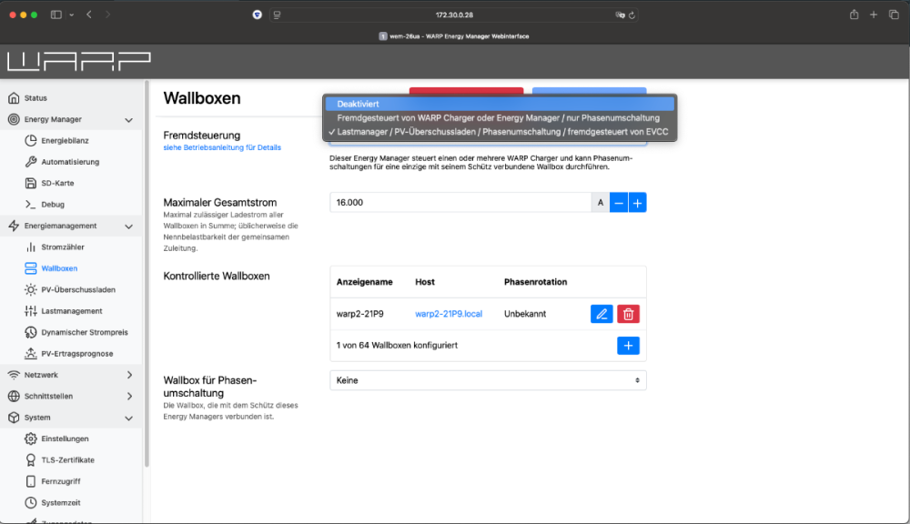 Ich kann im Energy Manager B die Proxy option nicht auswählen oder nicht finden. Auf einen der beiden Energy Manager kann ich für die Phasenumschaltung nicht die konfigurierte Wallbox auswählen. -