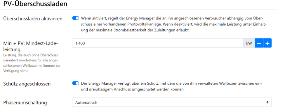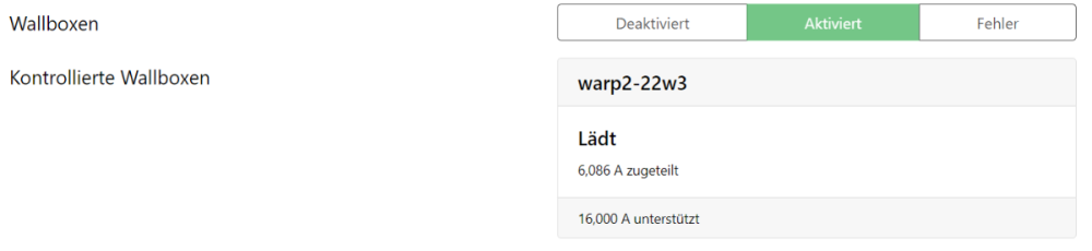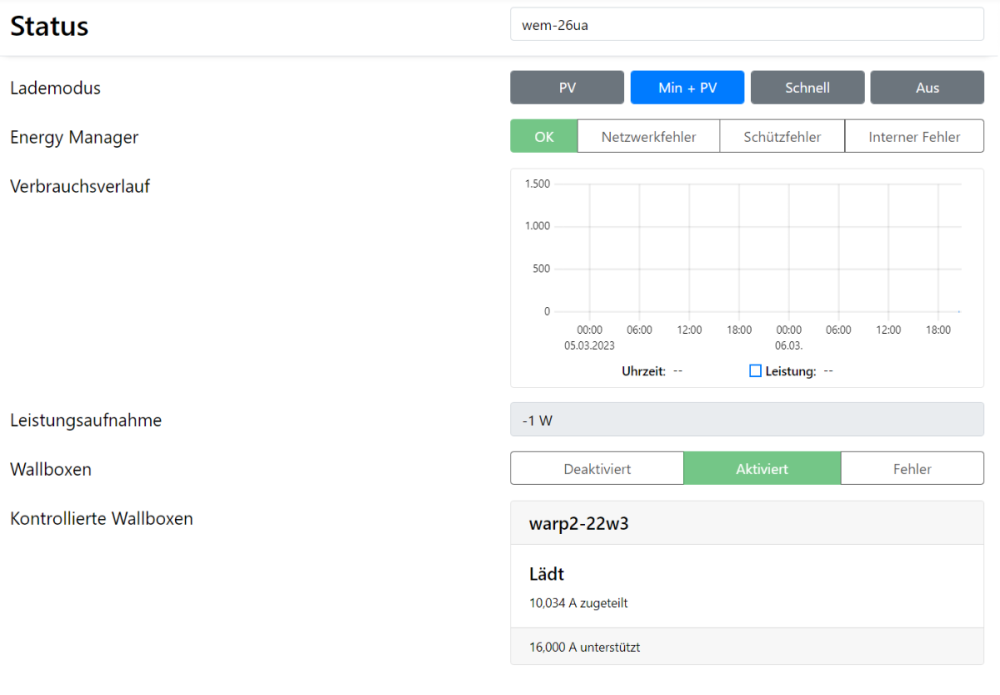 Hi, beim WEM scheint was mit der Einstellung MIN+PV nicht zu stimmen. Ich habe für MIN+PV 1,4KW eingestellt. Am Anfang wird dann auch mit etwa 6A geladen, nach einer Weile erhöht sich der Ladestrom, ob wohl kein PV-Strom zur Verfügung steht. Ist euch das schon bekannt? Oder ist da eventuell noch ein Bug in der Software? Ich habe mal einen paar Screenshot angefügt: Zuteilung beim Anfang vom Laden Zuteilung nach einiger Zeit: Einstellungen PV-Überschussladen