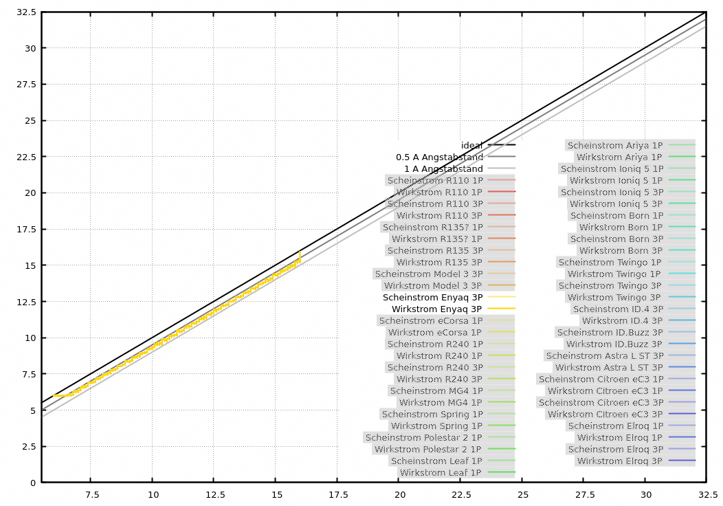 Das sieht top aus. So gut wie kein Fahrzeug zieht tatsächlich den erlaubten Strom. Fast alle bleiben mehr oder weniger darunter. Wir vermuten, dass die Fahrzeughersteller unter Anbetracht aller erlaubten Toleranzen den erlaubten Strom nicht überschreiten möchten und darum darunter bleiben. Wir nennen das deswegen gerne den „Angstabstand“. 😉 Ich habe dir hier mal die von uns gemessene Ladekurve eines Enyaq rausgekramt. Die ist allerdings nicht vom aktuelle Modell, sondern von der vorigen Generation. Man kann gut sehen, dass oberhalb von 6 A immer ungefähr 0,7 A Abstand zum erlaubten Strom gelassen werden. Wenn dein Enyaq also nicht mit exakt 16 A lädt, ist das völlig normal. Wenn dich das stört und du noch ein kleines Bisschen mehr Strom rauskitzeln möchtest, kannst du unter Wallbox → Einstellungen den Boost-Modus aktivieren. Dass die WARP tatsächlich 16 A freigibt (oder mit Boost 16,24 A) kannst du übrigens mit einem Oszilloskop oder einem anderen geeigneten Gerät verifizieren, entsprechendes Fachwissen vorausgesetzt. -