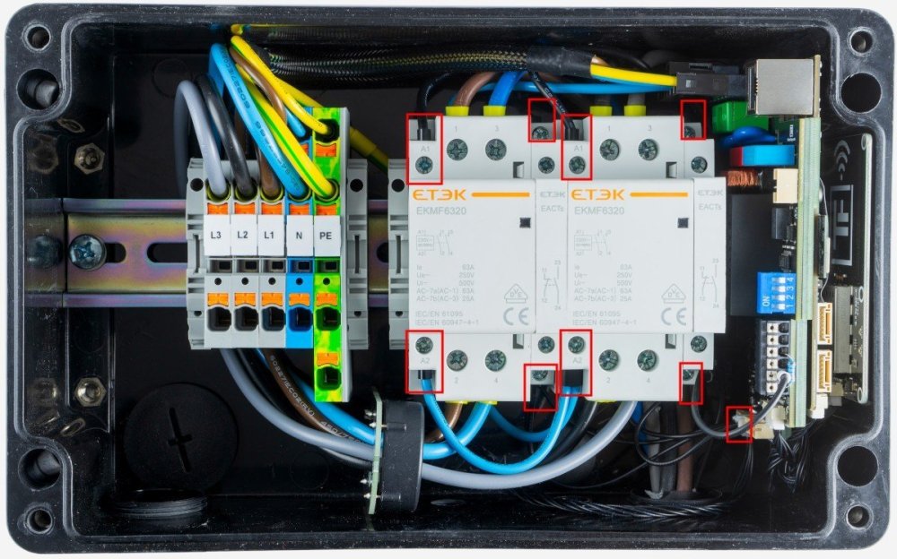 Ich dachte eher daran: Wallbox stromlos machen Frontplatte abschrauben. Wenn du sie nicht direkt unter der Wallbox ablegen kannst, kannst du den gelben Stecker am Taster und das Erdungskabel abziehen. Kontrolliere, ob an den acht markierten Stellen an den Schützen die Leitungen fest sitzen (siehe Bild unten). Wenn du eine Spitzzange oder ähnliches hast, einfach dran ziehen. Anschließend die Schrauben etwas nachziehen. Ich vermute, das sind PZ1-Köpfe. Kontrolliere bei der Platine unten rechts, ob der Stecker mit den vier Leitungen von den Schützen fest sitzt. Der ist ganz hinten drin und wahrscheinlich schlecht zu sehen und zu erreichen. Optional kannst du den Strom schon wieder einschalten und mit dem Multimeter die Spannung an den Hilfskontakten der Schütze messen. Das sind die mit „EACTs“ beschrifteten Dinger. Zwischen dem oberen und dem unteren Kabel sollten bei beiden Hilfskontakten die gleiche Spannung anliegen, vermutlich irgendwas im Bereich von 3 V. Anschließend die Frontplatte wieder anschließen und dabei die Position der Rastnase am Taster beachten und die Erdung nicht vergessen. Dann Frontplatte anschrauben und Strom wieder einschalten. Wenn du bei der Überprüfung irgendwas auffälliges gefunden und korrigiert hast, war’s das wahrscheinlich schon. -