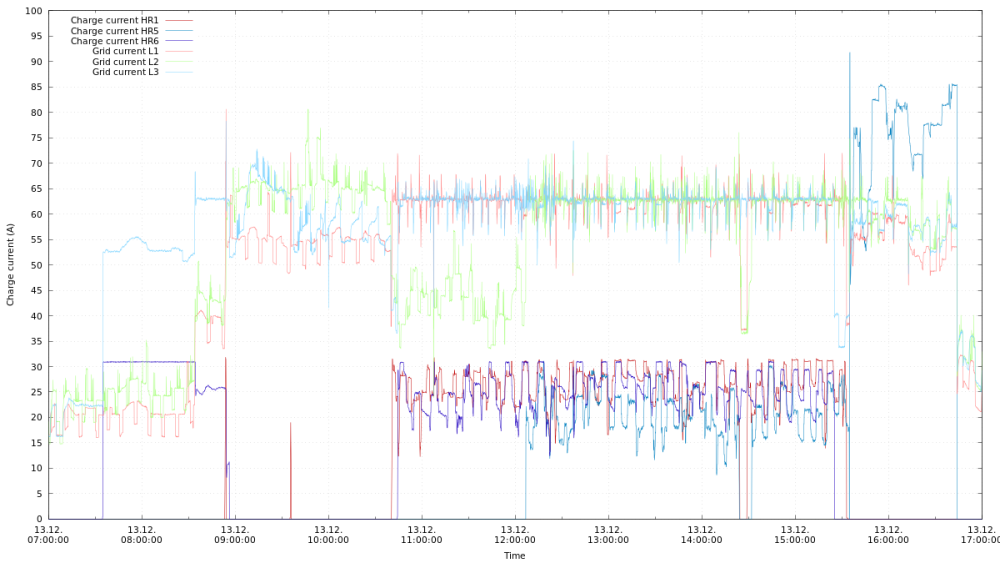 Seit Anfang dieses Jahres unterstützen alle WARP Charger dynamisches Lastmanagement, was dafür sorgen soll, dass ein unterdimensionierter Netzanschluss nicht von ladehungrigen Elektroautos überlastet wird. Für diejenigen, die das dynamische Lastmanagement mal in Aktion sehen wollen, habe ich hier den heutigen Stromverbrauch der Firma visualisiert. Da wegen horrender Strompreise gestern und vorgestern niemand laden wollte, war heute richtig was los. Acht Stunden lang war der 63 A-Netzanschluss fast komplett ausgelastet. Morgens kann man gut sehen, dass es einige Verbraucher gibt, die in Intervallen aktiv sind. Im Bereich 9:00 bis 10:30 haben die verschiedenen Verbraucher sogar zwei Phasen teilweise überlastet, obwohl alle Wallboxen im Lastmanagement bereits ausgeschaltet waren. Die Überlast wurde begünstigt von anderen Wallboxen, die nicht vom dynamischen Lastmanagement beeinflusst werden und die ganze Zeit mit voller Leistung geladen haben. Ab 10:30 waren dann die drei Wallboxen im Lastmanagement wieder aktiv und am Netzanschluss wurden 63 A eingeregelt. Am Ladestrom der Wallboxen (unten) kann man wieder gut die Intervalle der anderen Verbraucher sehen, die jeweils zu Einbrüchen in der Ladeleistung oder gar komplettem Abschalten führten. Gegen 15:30 waren dann zwei der Autos voll und die dritte Wallbox wurde auf dreiphasig umgeschaltet, sodass deren aufsummierter dreiphasiger Ladestrom auf bis zu 84 A stieg (3 x 28 A). Ab 16:45 war dann nur noch ein Auto an einer anderen Wallbox am Laden und die vorher angenehm warmen Sicherungen und Stromleitungen konnten wieder abkühlen. 😀 Vollgeladene Autos: 7 Rausgeflogene Sicherungen: 0 Fragen dazu oder wilde Spekulationen, was wir für Verbraucher in der Firma haben? Immer her damit.-