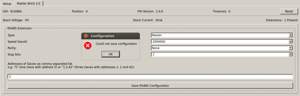 Hmmm ich habe da auch noch was gefunden. Bis jetzt hatte ich immer RS485 Extensions die schon eine Config hatten. Jetzt habe ich eine ganz neue. Da bekomme ich beim Speichern der Config einen Fehler. Es schein was mit der "Rolle" Master zu tuen zu haben. Meine Slave Einstellungen kann ich problemlos speichern.