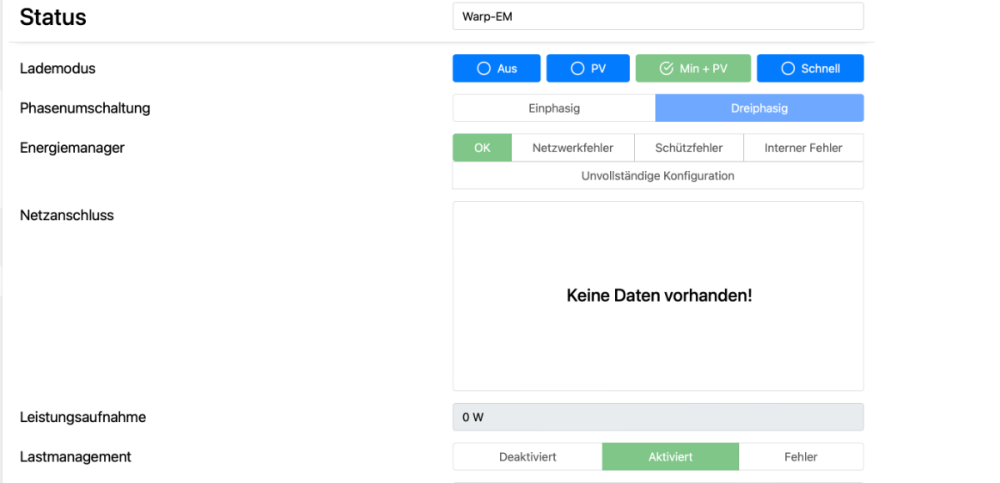 Hallo, hier kam nun alles gleichzeitig, PV, Speicher, E-Auto und Wallbox, was in der Gesamtkonfiguration dann doch etwas herausfordernd ist. Mein Ziel ist es, Überschussladen automatisiert via EVCC erledigen zu lassen. Bis dahin ist es aber noch ein Stück, wie ich mittlerweile recherchiert und herausgefunden habe (es fehlen noch die SunSpec Daten aus dem Goode WR in EVCC). Bis dahin dachte ich, realisiere ich eine einfache Lademöglichkeit, mit der Option, händisch, je nach Sonnenstand zwischen ein- und dreiphasigem Laden umzuschalten. Dazu habe ich aber noch zwei Fragen: 1) Soweit ich das in der Warp2 und dem Energy Manager gesehen habe, gibt es diesen "einfachen Knopf" aber nicht, oder? Ich kann nur im EM einstellen, dass in der Phasenumschaltung nur IMMER ein- oder dreiphasig geladen wird, korrekt? Den PV Modus zum Umschalten zweckzuentfremden geht ja vermutlich ohne Stromzähler nicht, oder? 2) Ich habe nicht ganz aufgepasst, als ich die Bestellung der Warp2 Smart aufgegeben habe, denn ohne Stromzähler in der Box kann ich ja gar nicht nachvollziehen, wie viel Strom geladen wurde. Ich möchte hier also gerne noch einen Stromzähler nachrüsten (entsprechende Vorschläge gibt es hier ja schon). Wenn ich den EM aber nun zum PV Überschuss Laden verwenden möchte, bracht der ja auch einen Stromzähler...brauche ich dann zwei Stück (einen für den EM, den anderen in der Warp2) oder kann der EM seine Daten an die Warp2 weitergeben? Grüße, Knut
