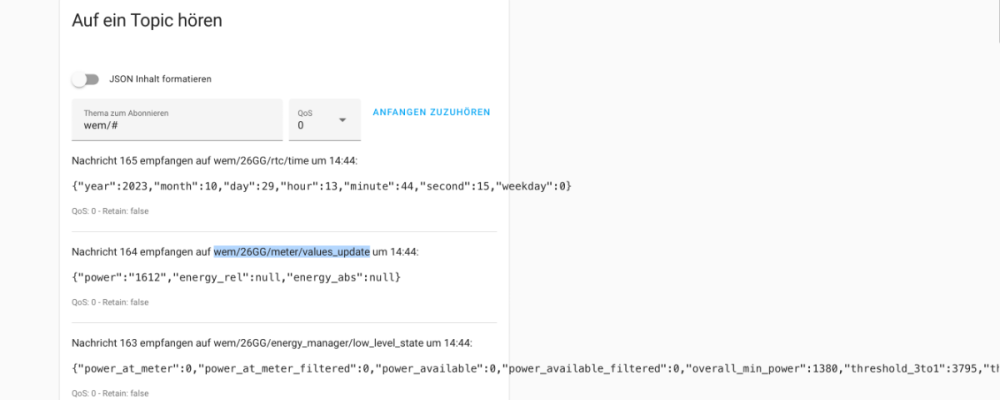Hmm, irgendetwas fehlt noch. Ich habe erfolgreich von Node Red die MQTT Info an den MQTT Broker (mosquito, auf Home Assistant) mit dem Topic: wem/26GG/meter/values_update zum Senden bekommen. Eine Abfrage im MQTTBroker bestätigt mir das Empfangen meiner Node Red Nachricht, als auch das Empfangen von WEM Topics. Irgendwie scheint sich der WEM aber nicht das Topic zu subscriben, denn die Anzeige des Netzanschlusses bleibt tot. Entweder ist meine Nachricht fehlerhaft (ich muss noch die Vorzeichen konvertieren) oder etwas stimmt nicht mit meiner Route. Ist die Einrichtung einer Client ID für den WEM zwingend oder reicht die Topic Adressierung? -