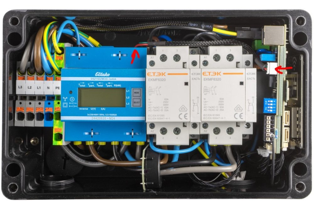 Ja die Wallbox entscheidet ob sie eine Smart oder Pro anhand des vorhandenseins des Stromzählers. Da der Stromzähler anscheinend nicht ansprechbar ist denkt die Wallbox jetzt dass sie eine Smart ist. Deine Wallbox ist ja noch sehr neu, weißt du ob der Stromzähler seitdem du sie in Betrieb genommen hast jemals funktioniert hat? Falls nicht wäre mein Gedanke das vielleicht das Anschlusskabel zum Zähler während der Installation ausversehen rausgezogen wurde. Das sitzt hier (siehe rote Pfeile): da wäre dann jetzt der nächste Schritt die Wallbox nochmal stromlos zu machen, aufzuschrauben und das Kabel zu prüfen. Wenn es das Kabel nicht ist sind wir irgendwann bei dem Punkt das entweder der Zähler oder der Ladekontroller der den Zähler ausliest einen Defekt haben muss.