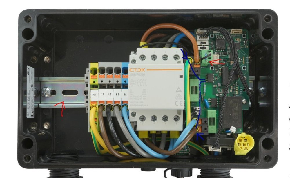 Also rein technisch misst das EVSE die 50Hz zwischen L1 und PE die vor dem Schütz sind. Im Ladeprotokoll kann man sehen dass dort nichts gemessen wird. Da der EVSE gar nicht erst laufen würde wenn kein L1 da ist, gehen wir in diesem Fall davon aus das es ein Problem mit PE ist. Um ganz sicher zu sein dass PE beim EVSE ankommt, könntest du einmal im unbestromten Zustand zwischen der Hutschiene und dem unteren Beinchen des CP/PP-Widerstands messen (roter Pfeil im Bild). In blau hab ich markiert in welchem Stecker PE und L1 beim EVSE ankommen, L1 geht dann über die Sicherung und über ein paar andere Bauteile zu einem Optokoppler und von da direkt zum Mikrocontroller. Wenn die Sicherung i.O. ist und PE definitiv beim EVSE ankommt muss es denke ich ein Hardwaredefekt beim EVSE sein. Eventuell ist der Optokoppler oder eines der Bauteile zwischen Eingangsstecker und Optokoppler defekt. In dem Fall sehe ich zwei Möglichkeiten: Du schickst die Box ein, wir reparieren sie und schicken sie zurück oder wir schicken dir ein neues EVSE und du müsstest das dann selber einbauen oder einbauen lassen. Ersteres hat den Vorteil dass du dir 100% sicher sein kannst eine heile Wallbox zurück zu bekommen, auch wenn es vielleicht doch nicht am EVSE liegt. Schreib dazu einmal eine Email an sales@tinkerforge.com mit Hinweis auf diesen Thread dann können wir den Rückversand oder Versand eines EVSE in die Wege leiten.
