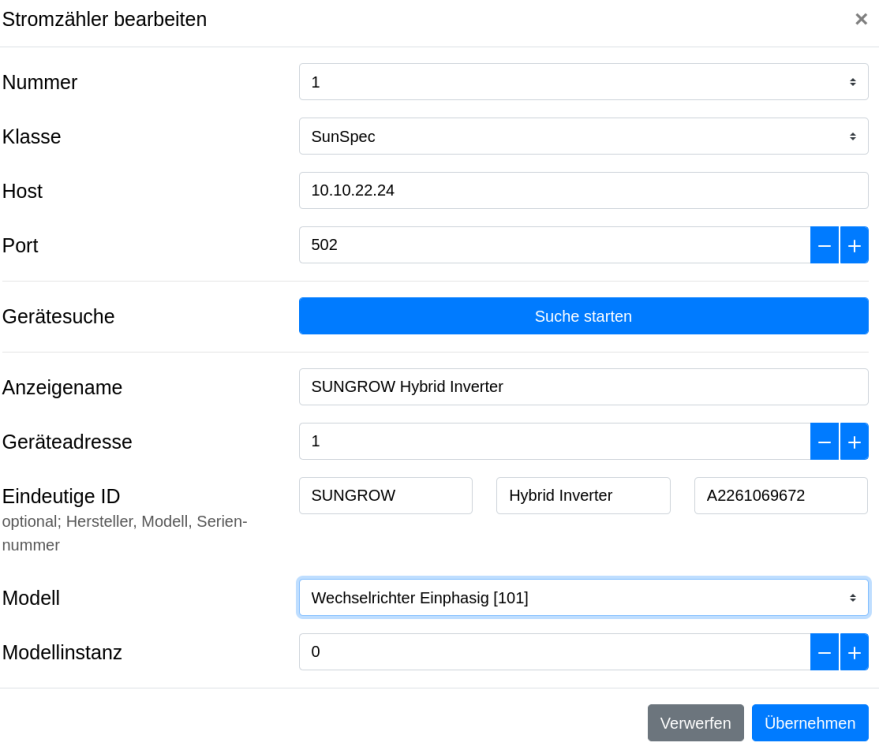 Ich mach dir mal einen Screenshot. Die Werte "Anzeigename, Geräteadresse, Eindeutige ID" werden vom Scan ausgelesen, aber das scheint mir nur zu Anzeigezwecken zu dienen: Die Musik spielt wohl bei "Modell", "Geräteadresse" und "Modellinstanz". Da kannst du aber nicht Hersteller/Typ auswählen sondern die nach SunSpec definierten Datenmodelle. Eigentlich ist es ja auch Sinn des Standards, dass er herstellerübergreifend funktioniert, aber irgendwas passt hier noch nicht. -